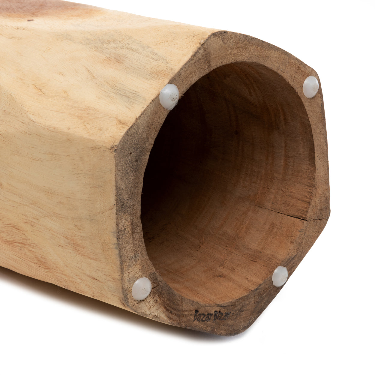 Suarhout varieert altijd in tint, kleur en patroon. Hout is een levend materiaal dat uitzet en krimpt, waardoor scheuren en knoesten kunnen ontstaan. We nemen maatregelen tijdens het transport en in ons magazijn om suar houten voorwerpen te drogen en te coaten, maar het kan nog steeds vocht bevatten dat er na verloop van tijd uit kan sijpelen.