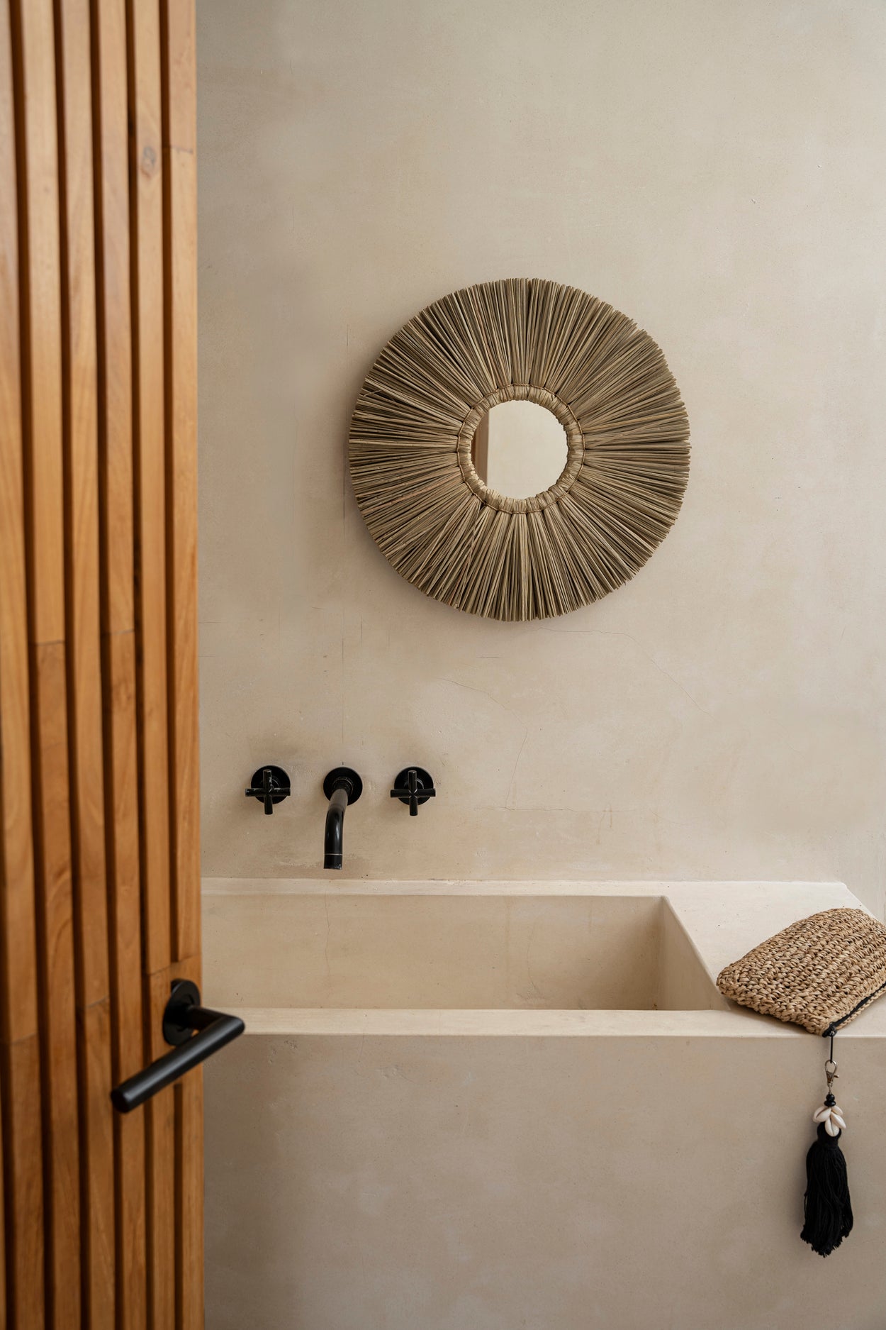 Deze prachtige spiegel brengt een vleugje kusttextuur in uw huis. Gemaakt van prachtig gras rondom een spiegelcentrum. Meer dan ooit trendy, brengt het een prachtige aardse boho touch aan uw interieur. Een geweldige look voor elke kamer.