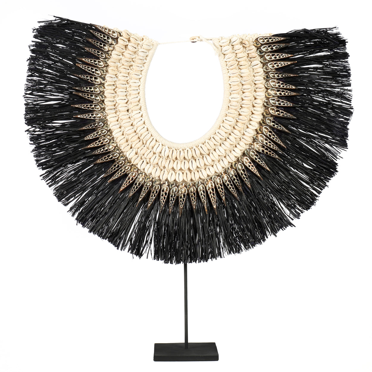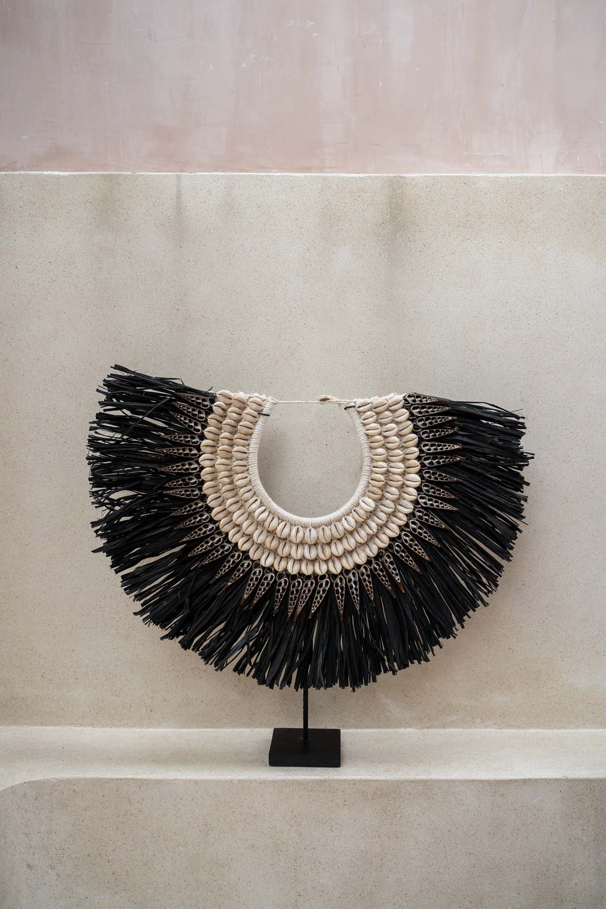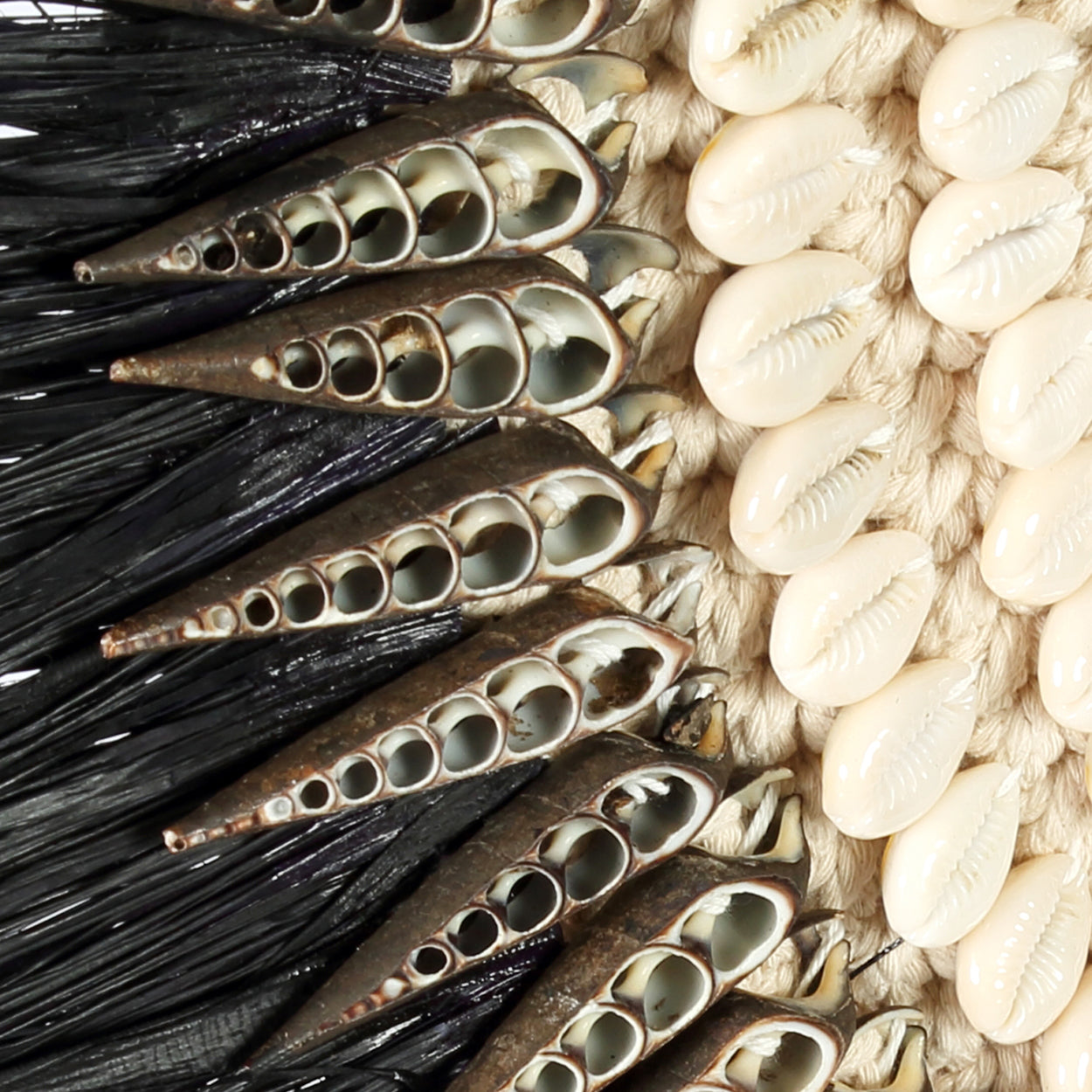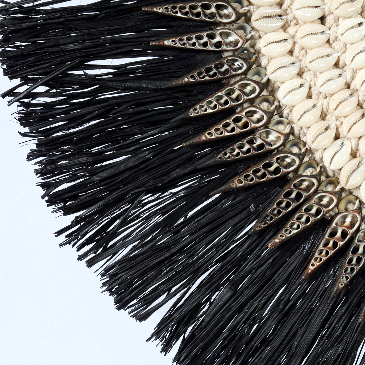 Deze prachtige raffia display op standaard is een prachtig decoratief item. De binnenste halve cirkel is versierd met mooi met de hand geplaatste schelpen. Het verdient absoluut een speciale plaats om uw interieur of overdekt terras te versieren of om uw favoriete plekje thuis op te fleuren.