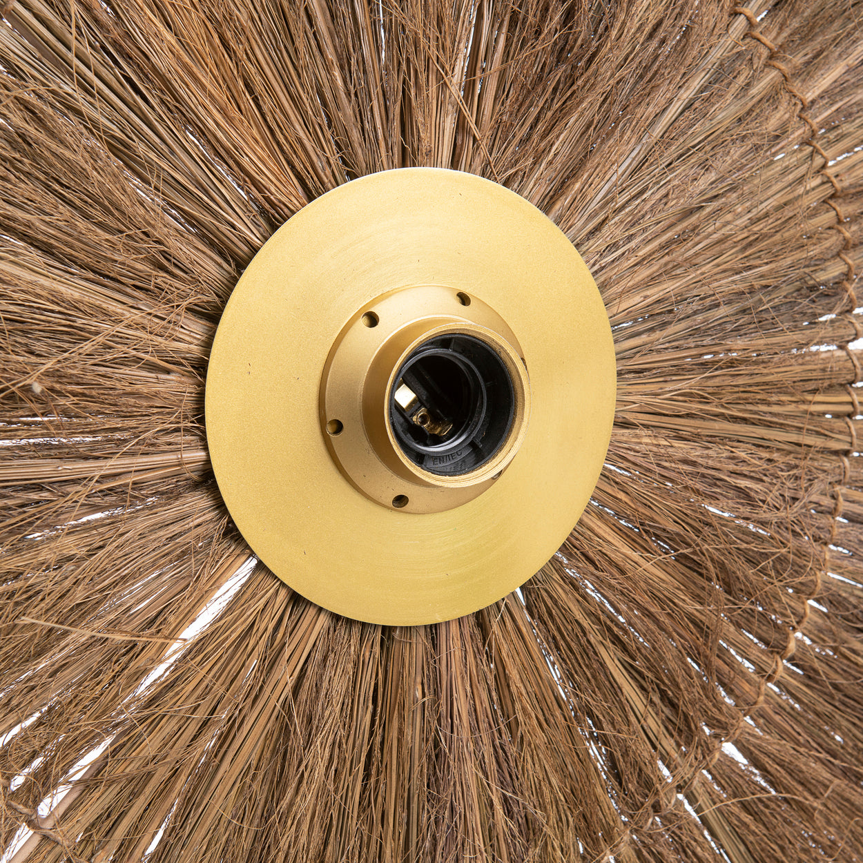 Deze Chi-Chi wandlamp van gras en ijzer is een prachtige aanvulling op elke lege muur in je huis. De neutrale tinten combineren gemakkelijk met elk meubilair en decor, vooral dankzij de tactiele structuur van het gras. Het ronde, platte ontwerp zorgt voor veel licht zonder het zicht te belemmeren. Perfect voor donkere gangen of overdekte buitenruimtes! Er zijn twee formaten verkrijgbaar en ze gaan geweldig samen...