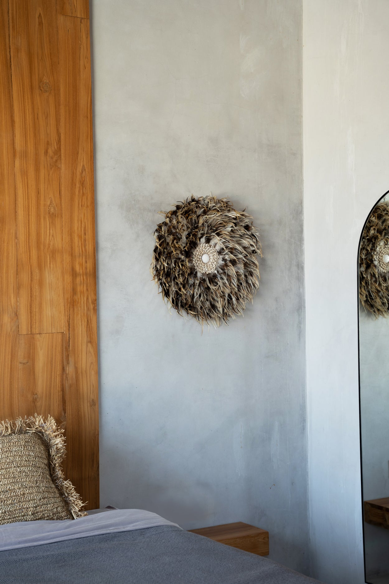 Onze prachtige feather wanddisplay is een echte bohemien schoonheid om elke muur in uw interieur, overdekt terras of tuin te versieren. De middelste cirkel is omgeven door met de hand geplaatste schelpen.