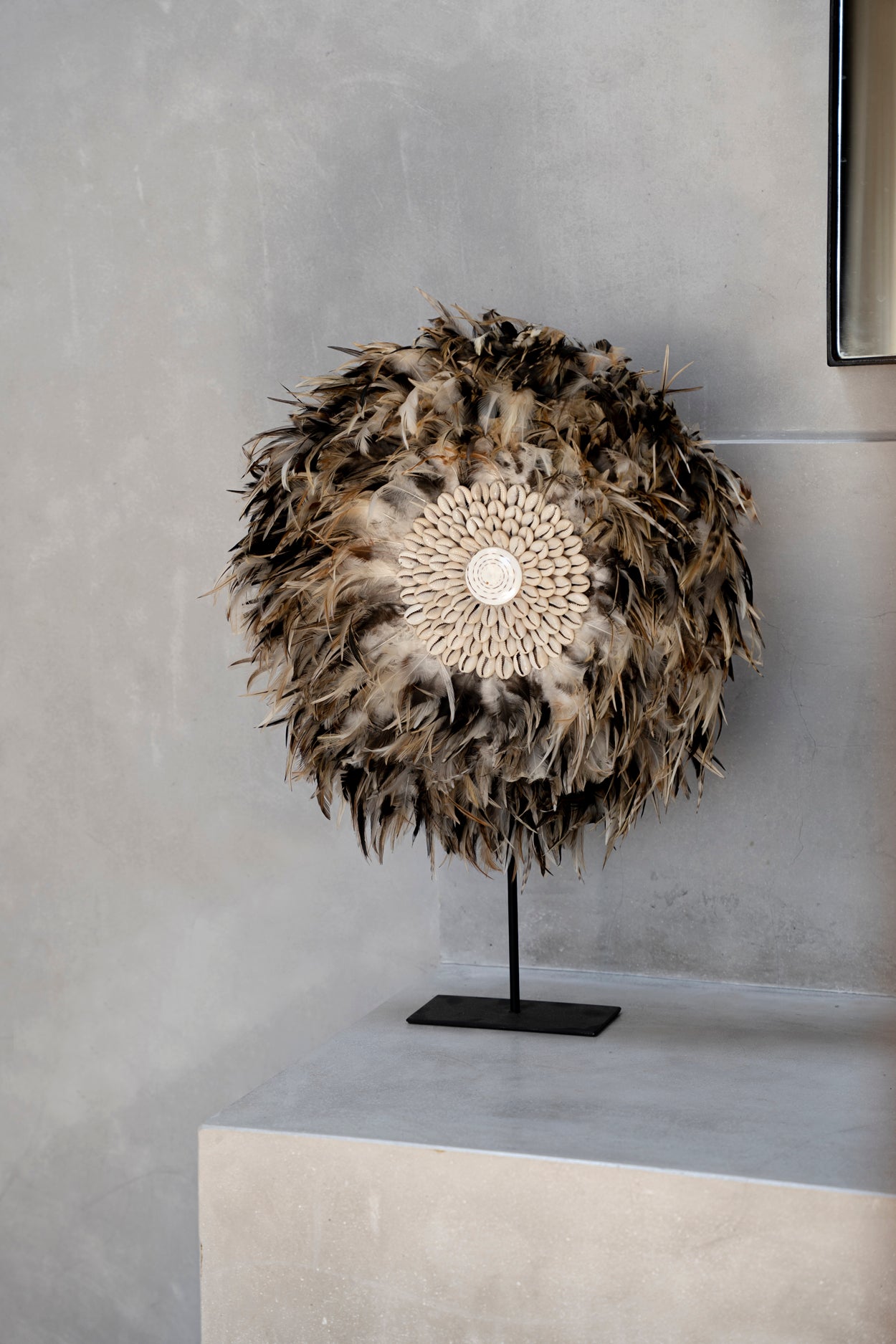 Onze prachtige veren display op standaard is een echte bohemien schoonheid om elke plaats in uw interieur, overdekt terras of tuin te versieren. De centrale cirkel is omringd door met de hand geplaatste schelpen.