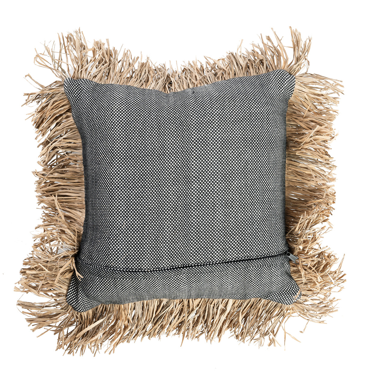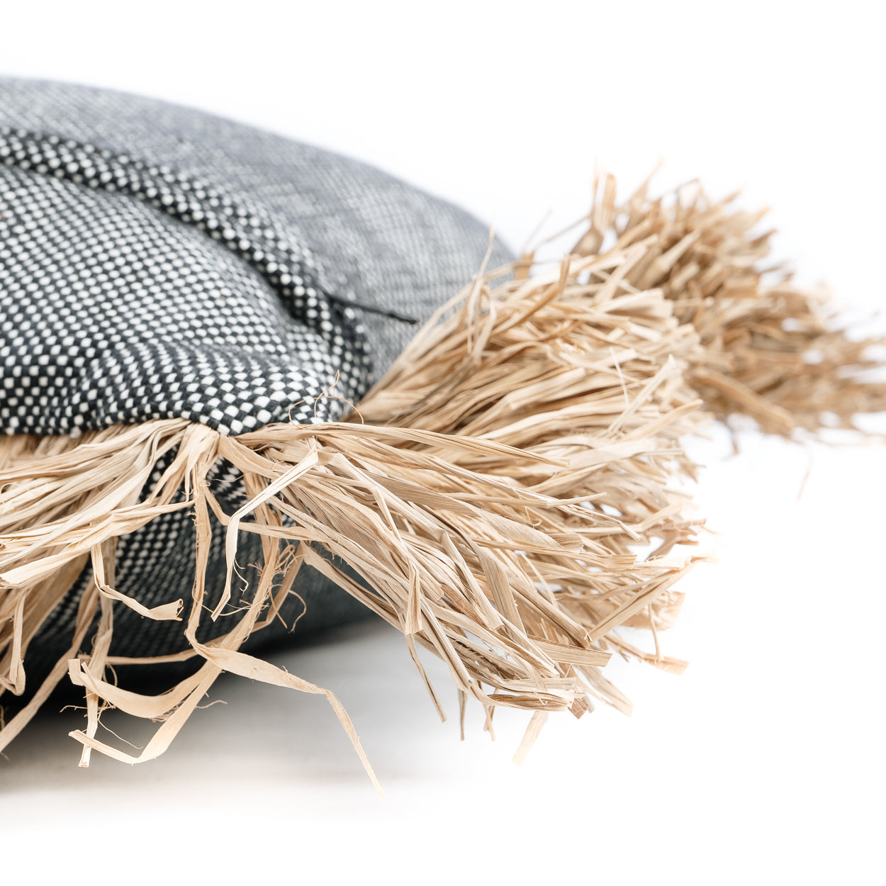 Deze prachtige kussenhoes is een echt stijlstatement in uw huis. Het combineert een zwart-wit gestippeld katoenen kussen met raffia franjes, waardoor het 'coastal' ontwerp naar een hoger niveau wordt getild. Dit is het perfecte item om wat vakantievibes toe te voegen aan uw interieur, tuin of terras. Verkrijgbaar in drie maten!