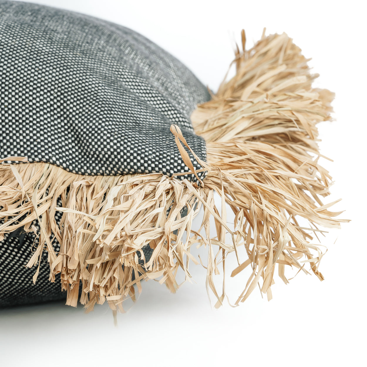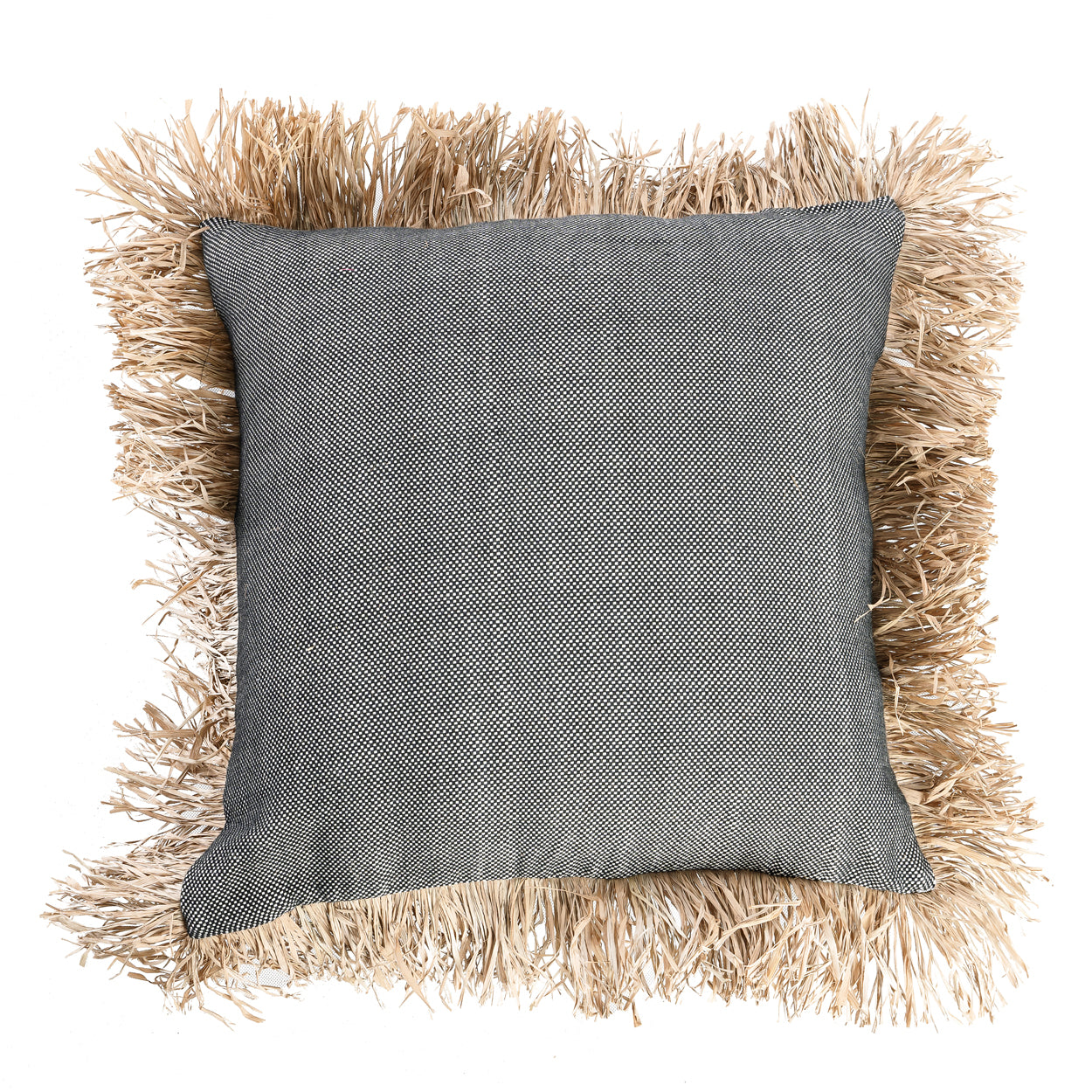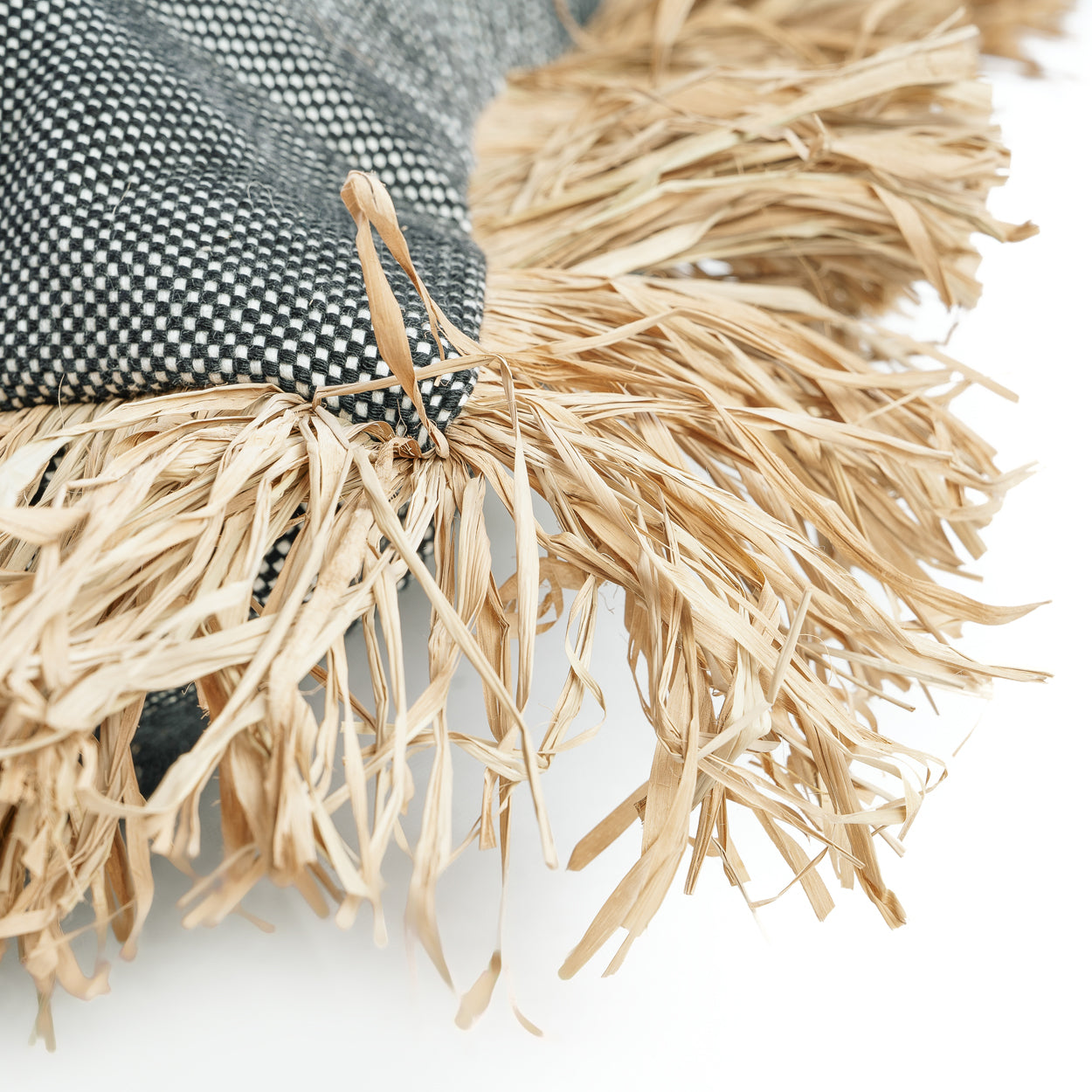 Deze prachtige kussenhoes is een echt stijlstatement in uw huis. Het combineert een zwart-wit gestippeld katoenen kussen met raffia franjes, waardoor het 'coastal' ontwerp naar een hoger niveau wordt getild. Dit is het perfecte item om wat vakantievibes toe te voegen aan uw interieur, tuin of terras. Verkrijgbaar in drie maten!