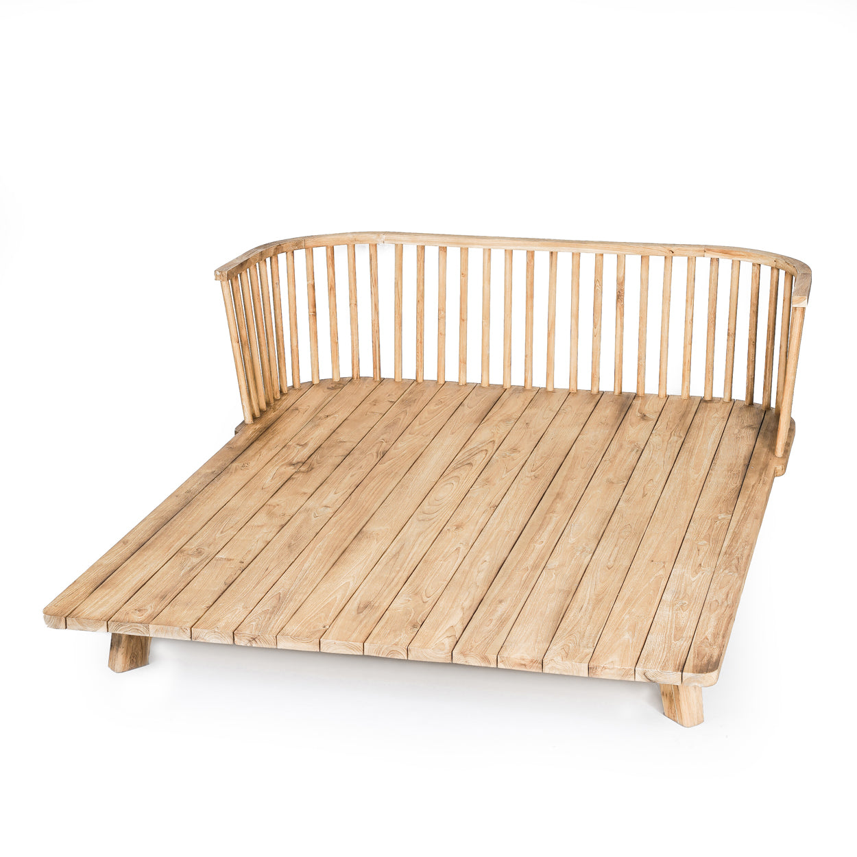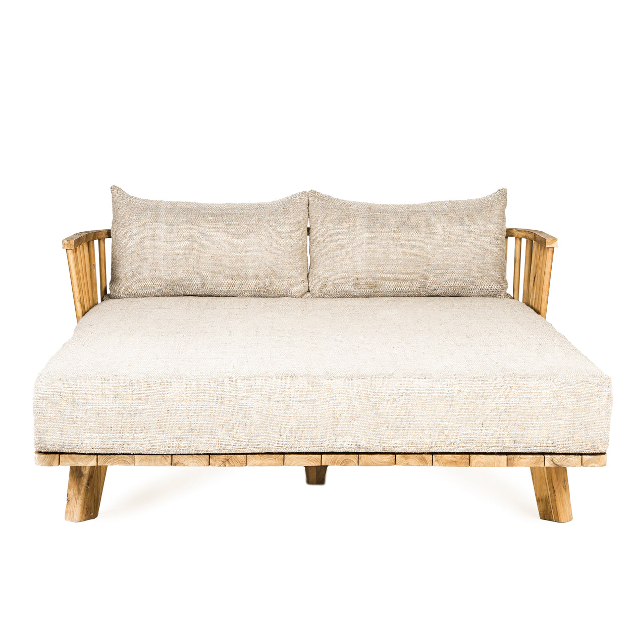 Verfraai je binnen- of overdekte buitenruimte met ons zorgvuldig vervaardigde dubbele daybed, gemaakt van teruggewonnen teakhout en met pluchen kussens voor binnen.