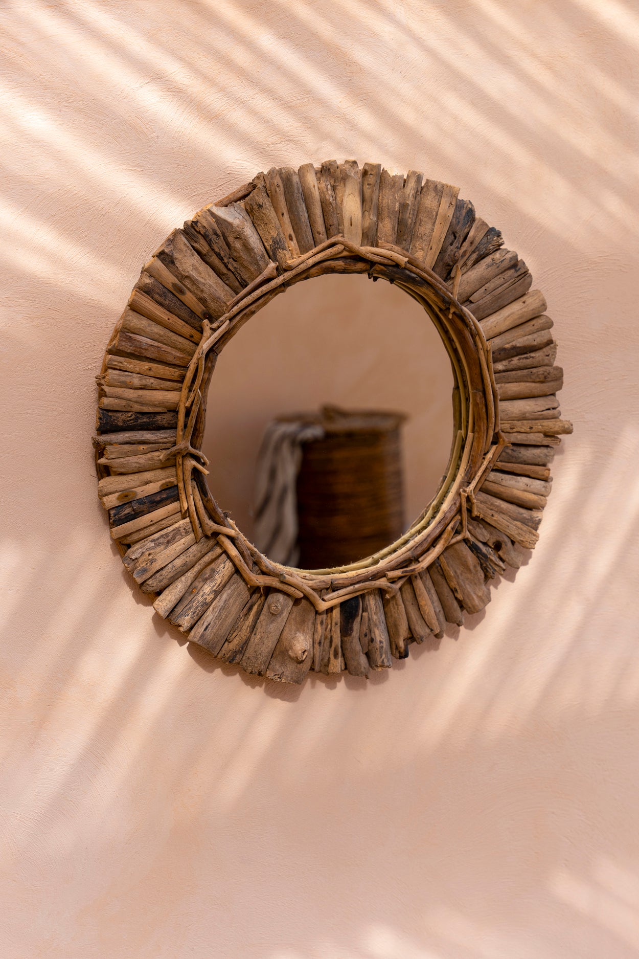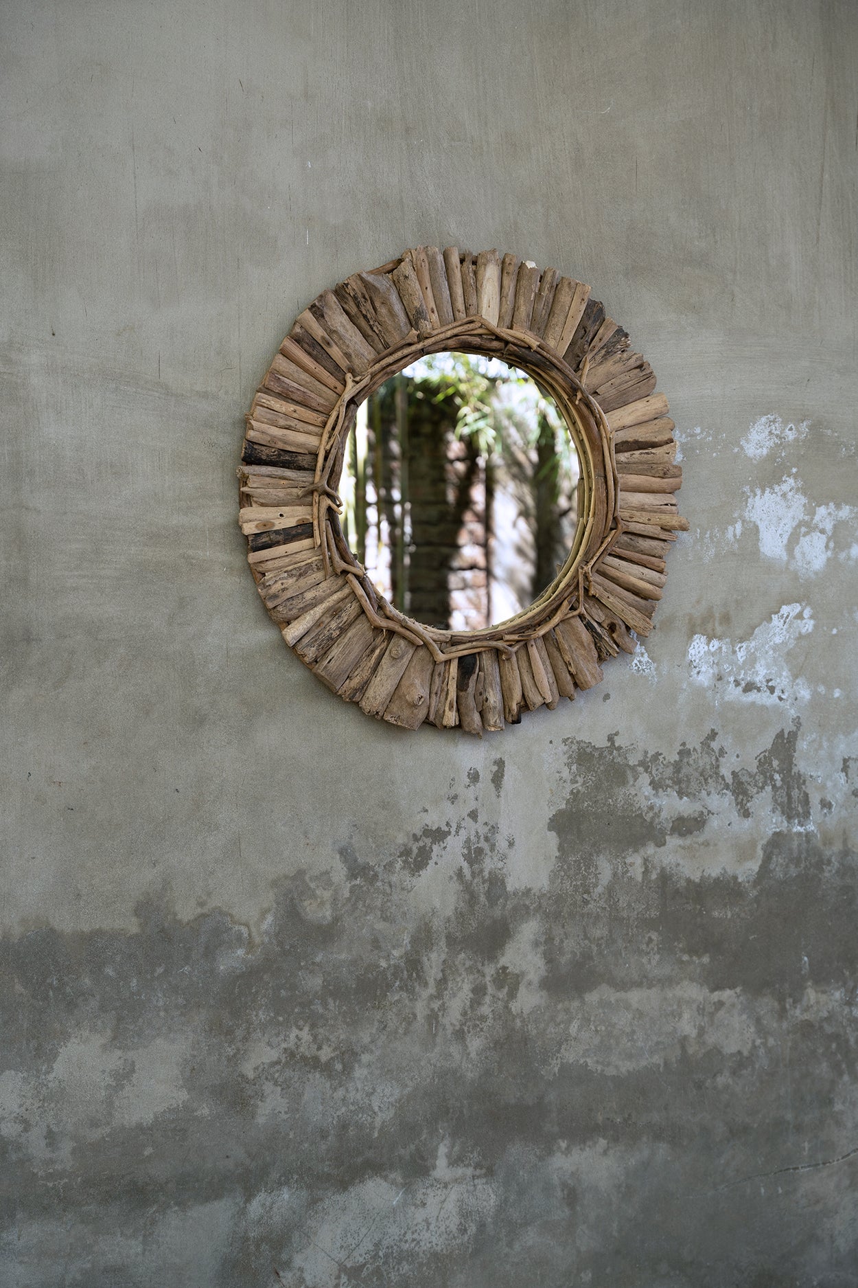 Deze prachtige spiegel is gemaakt door stukken drijfhout te verzamelen en ze rond het ronde glas in het midden te plaatsen. Geen enkele spiegel is precies hetzelfde!