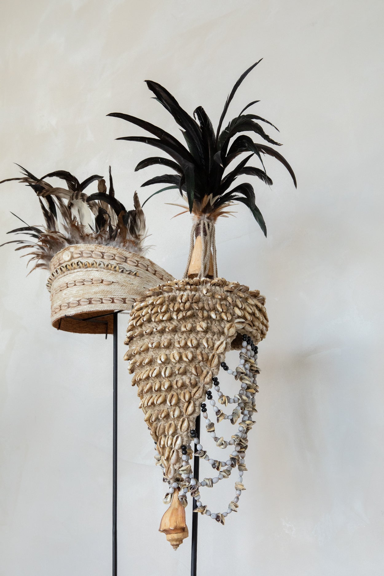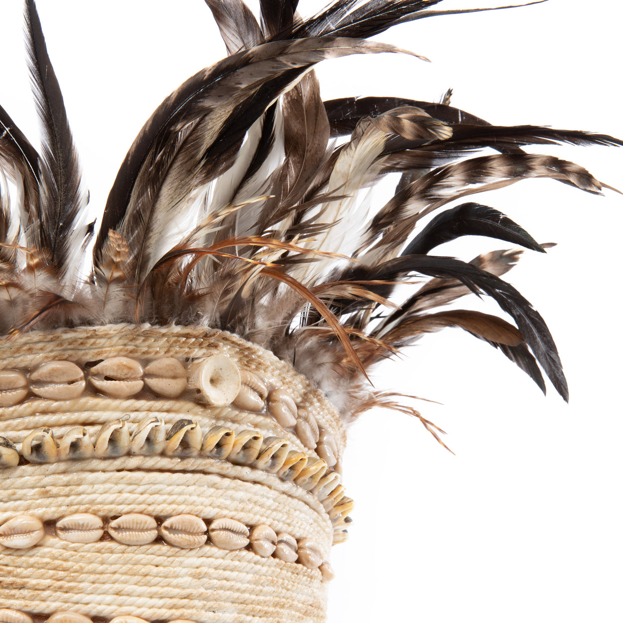 Dit prachtige kunstwerk combineert veren, schelpen en touw - allemaal verzameld van de stranden van Bali - tot een pronkstuk voor elke kast, open haard, tafel of waar u maar een uniek stuk nodig hebt om de show te stelen.