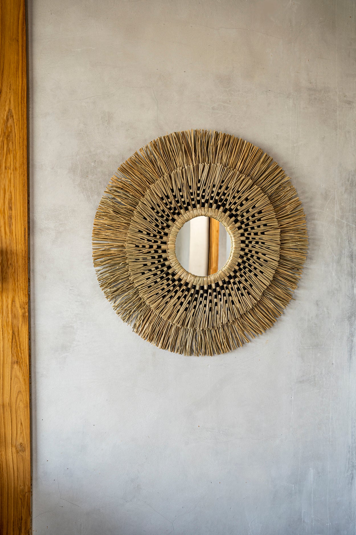 Het kan niet kustueuzer dan deze prachtige ronde spiegel versierd met rijen cowrie schelpen en gras! Het formaat is perfect voor zowel kleinere kamers (zoals een badkamer of poederkamer) als grotere ruimtes.