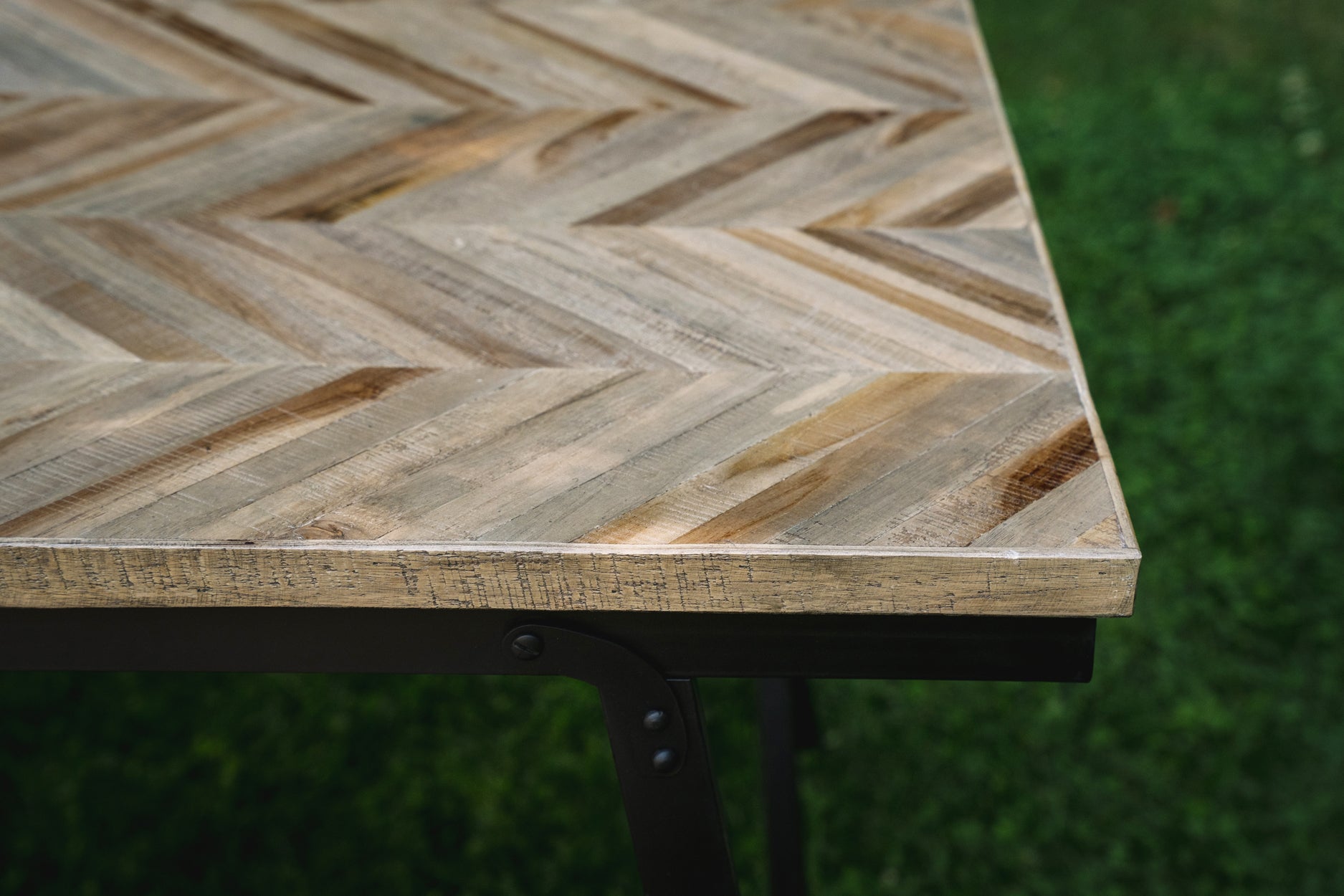 Deze hoogwaardige tafel is gemaakt van teakhout (in een zeer elegant visgraatpatroon) en zwart ijzer. De tafel is inklapbaar en heeft de ideale hoogte om te dienen als uw familie-eettafel, zowel binnen als overdekt buiten.