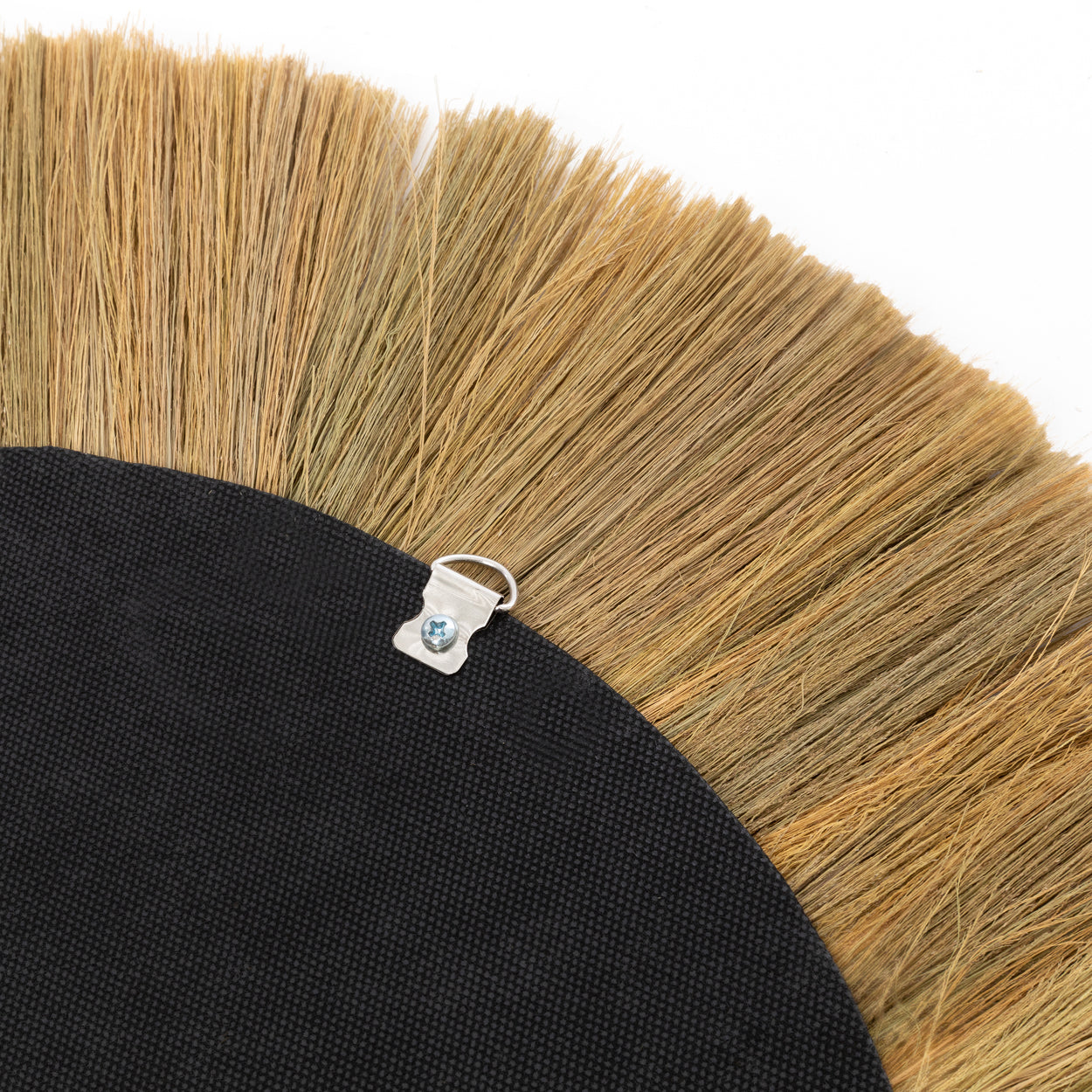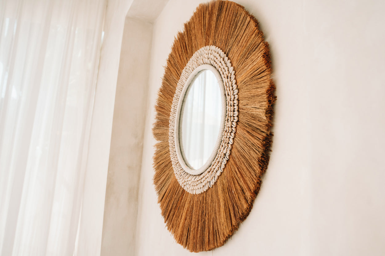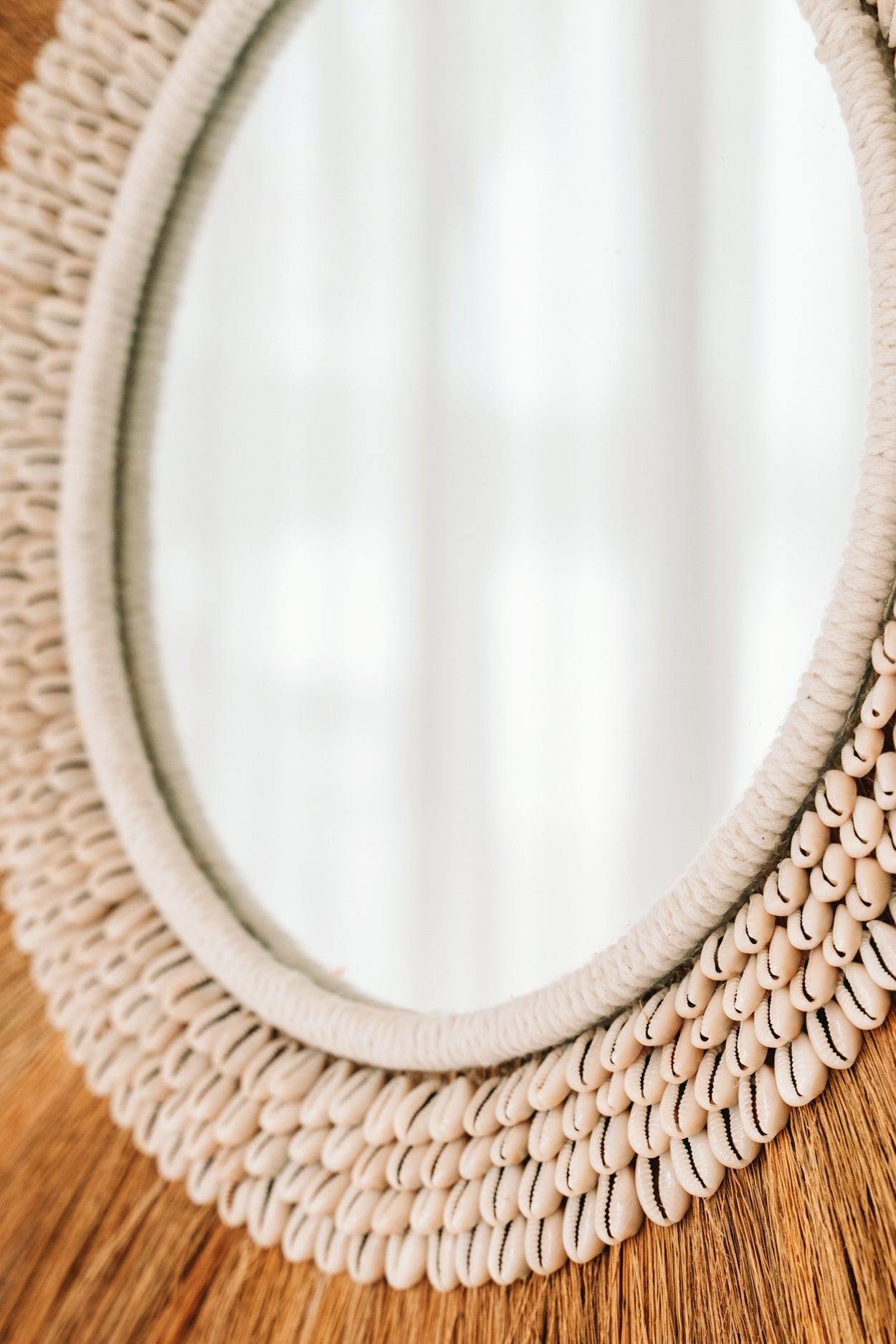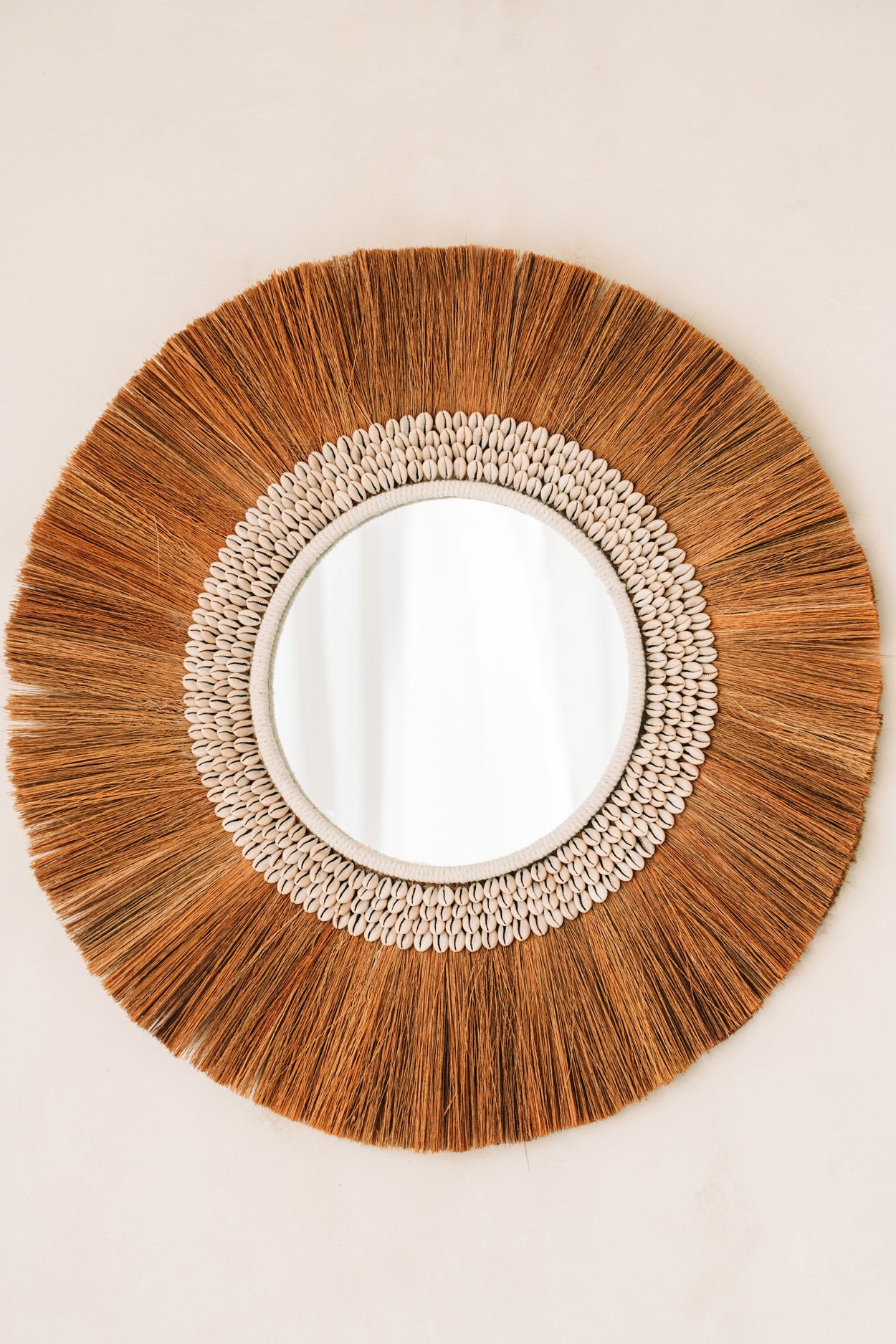 Het kan niet kustueuzer dan deze prachtige ronde spiegel versierd met rijen cowrie schelpen en gras! Zijn formaat is perfect voor zowel kleinere kamers (zoals een badkamer of poederkamer) als grotere ruimtes.