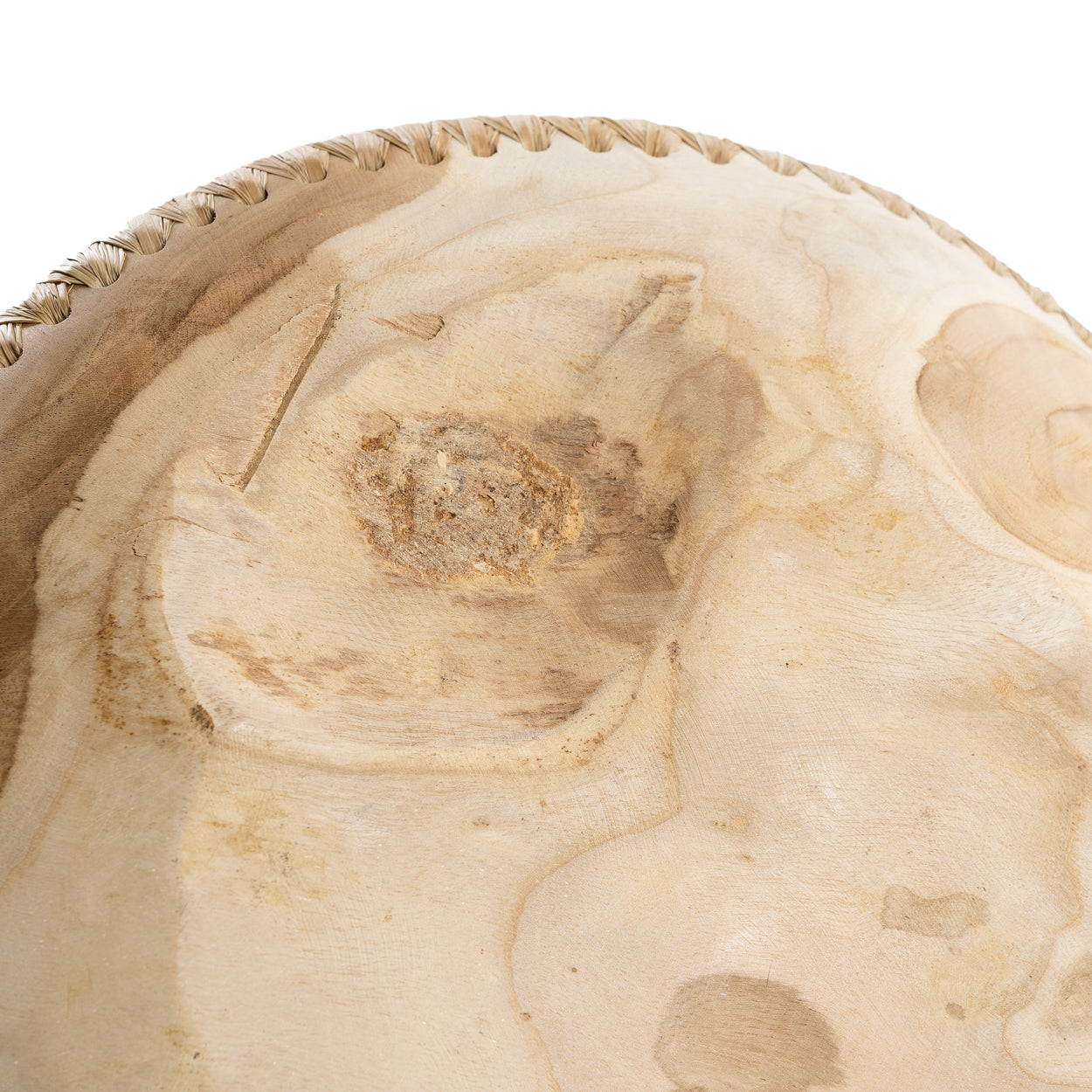 Presentatie is alles! Met deze luxe, organische schaal van teakhout en raffia heeft uw tafelschikking er nog nooit zo goed uitgezien. Er zijn drie maten beschikbaar en elk stuk is volledig uniek. Gebruik hem om eender wat te tonen, van fruit tot noten of chips.