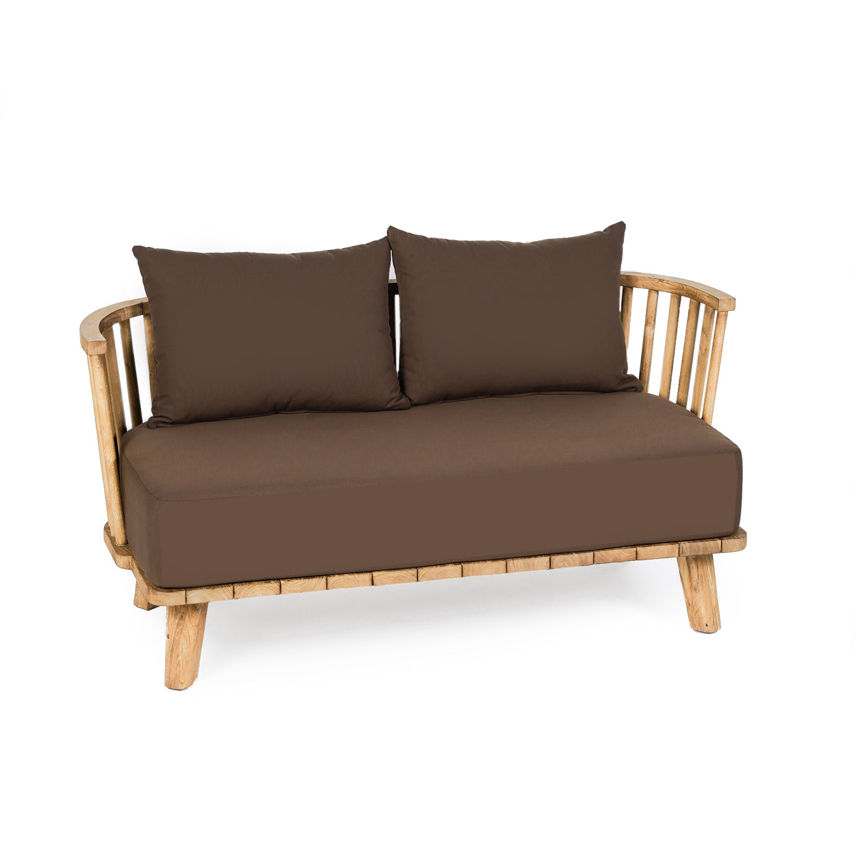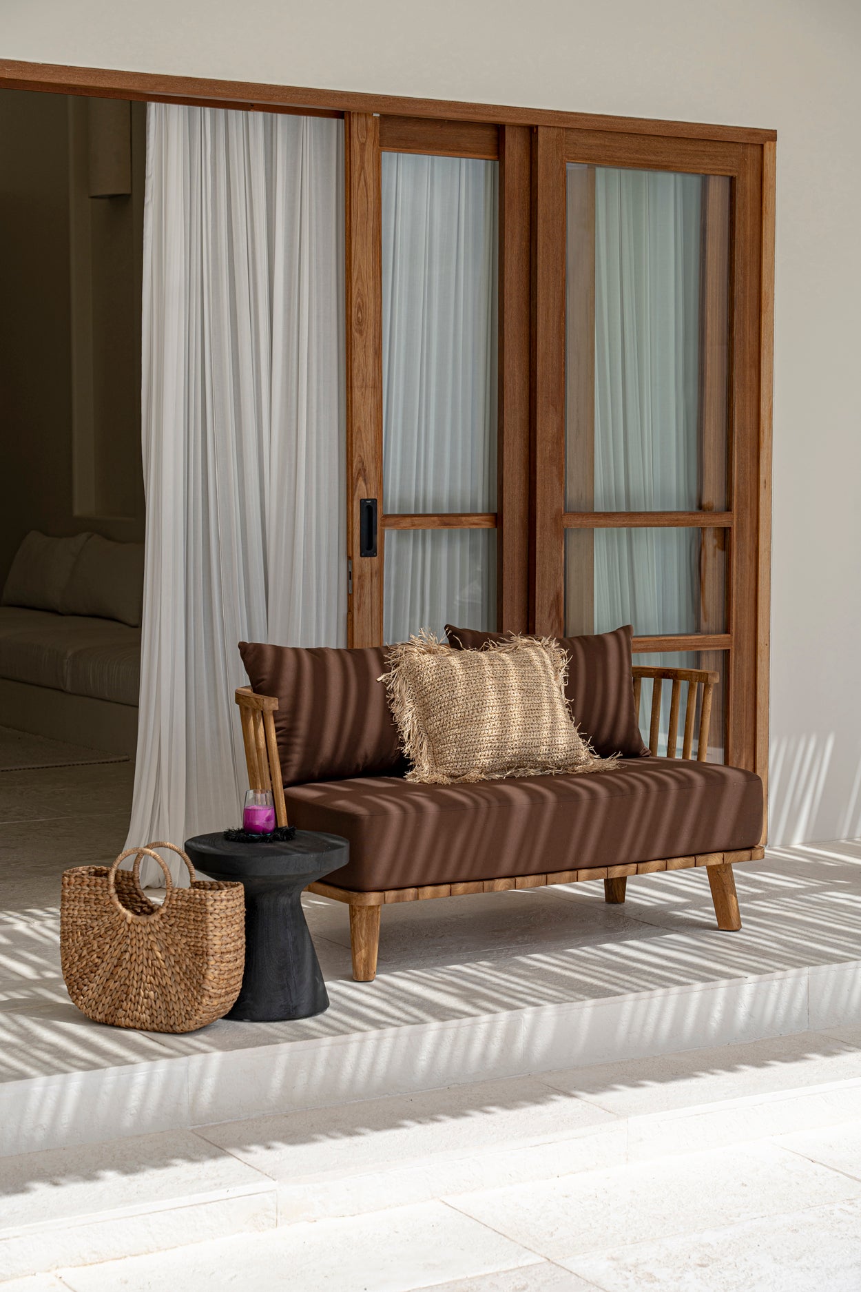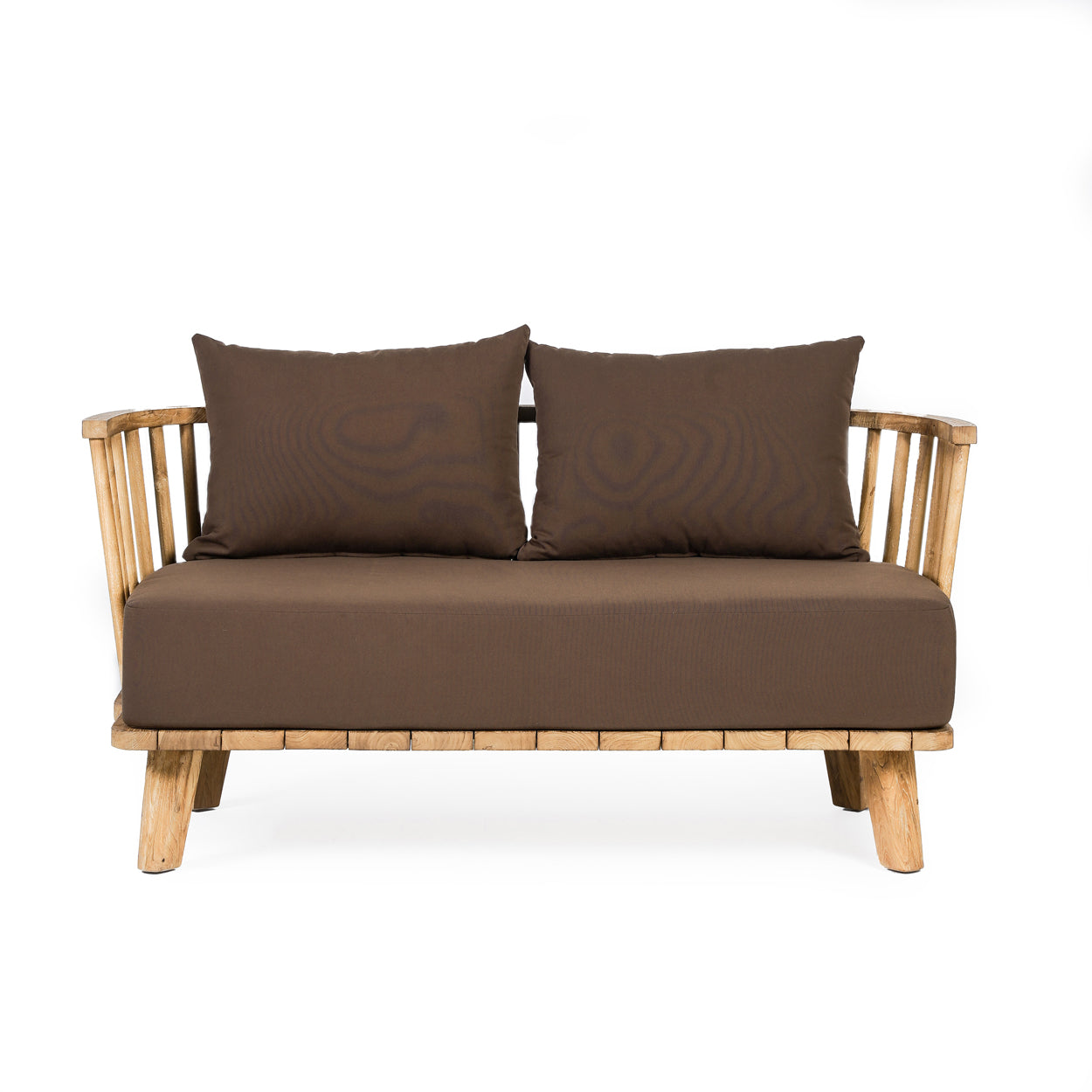 Maak kennis met onze tweezitsbank voor buiten, vakkundig gemaakt van hergebruikt teakhout met kussens voor buiten. Elk stuk heeft een unieke geschiedenis en voegt elegantie toe aan je buitenruimte. De waterafstotende kussens bieden uitzonderlijk comfort en duurzaamheid. Of je nu wilt genieten van de zon met een goed boek of gewoon een moment wilt nemen om te genieten van de schoonheid van de natuur, onze tweezitter biedt de perfecte plek om dat te doen. Ontspan en geniet van het buitenleven met deze milieuvriendelijke en stijlvolle zitoptie. De stof die je hier ziet is geschikt voor buiten. Om de kussens mooi te houden, raden we aan ze naar binnen te halen als je ze niet gebruikt. De kleuren kunnen iets afwijken van je beeldscherm.