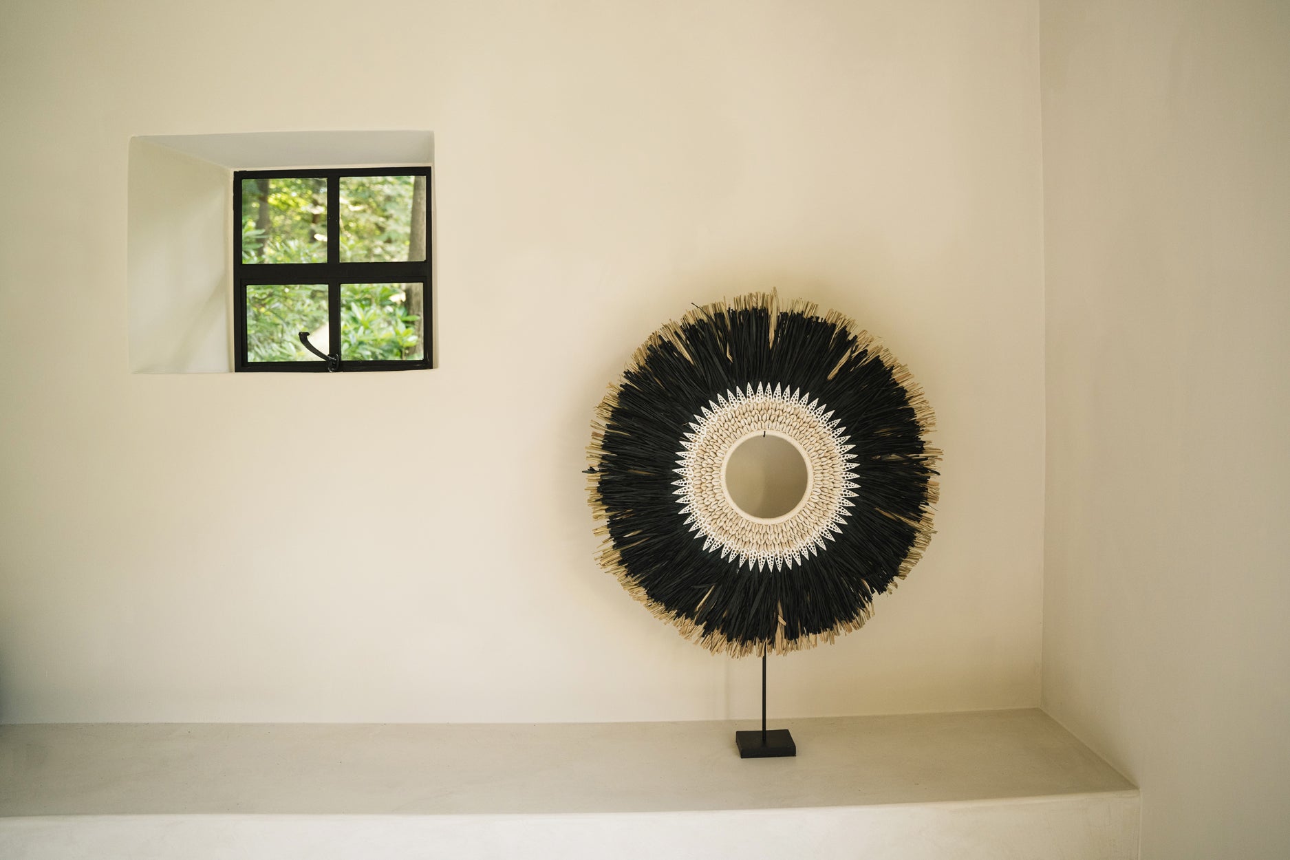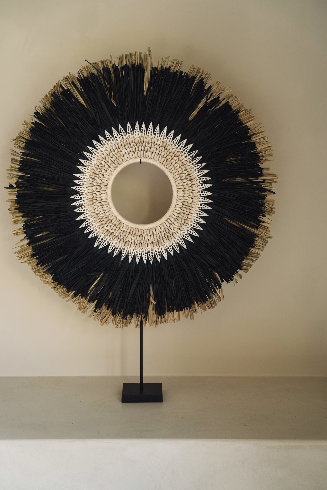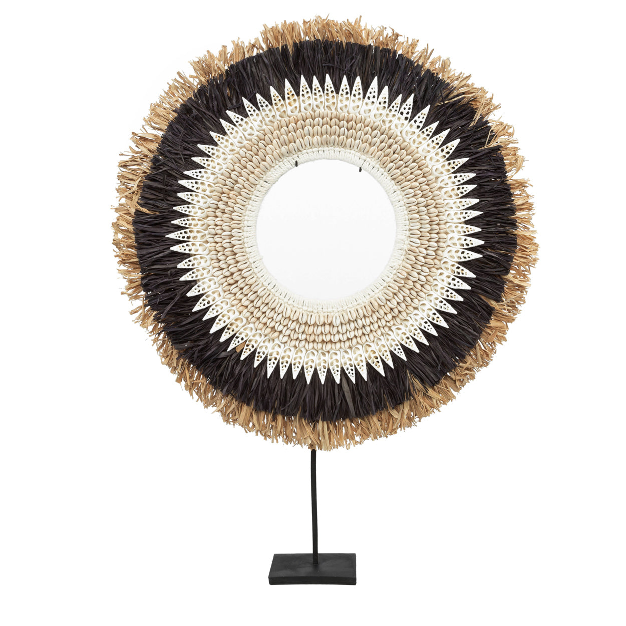 Deze prachtige raffia hoepelvormige display op standaard is een prachtig decoratief item. De binnenste cirkel is versierd met mooi met de hand geplaatste schelpen. Het verdient absoluut een speciale plaats om uw interieur of overdekt terras te versieren of om uw favoriete plekje thuis op te fleuren.