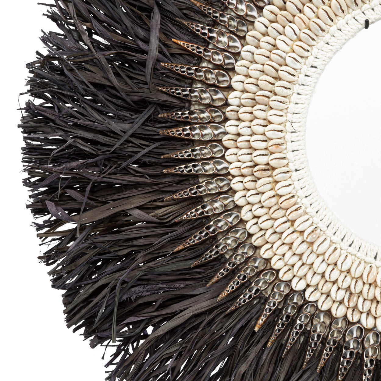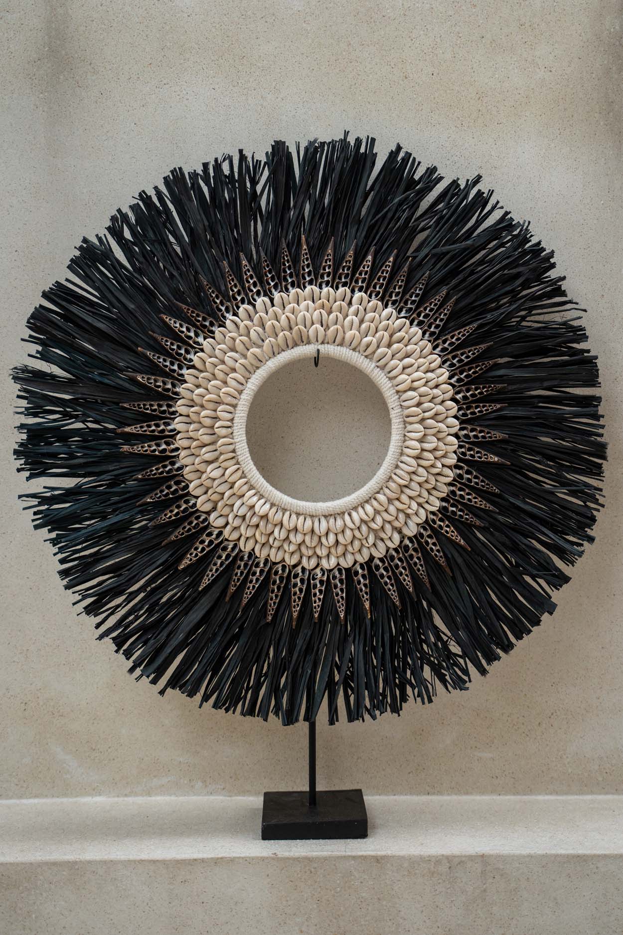 Deze prachtige raffia hoepelvormige display op standaard is een prachtig decoratief item. De binnenste cirkel is versierd met mooi met de hand geplaatste schelpen. Het verdient absoluut een speciale plaats om uw interieur of overdekt terras te versieren of om uw favoriete plekje thuis op te fleuren.