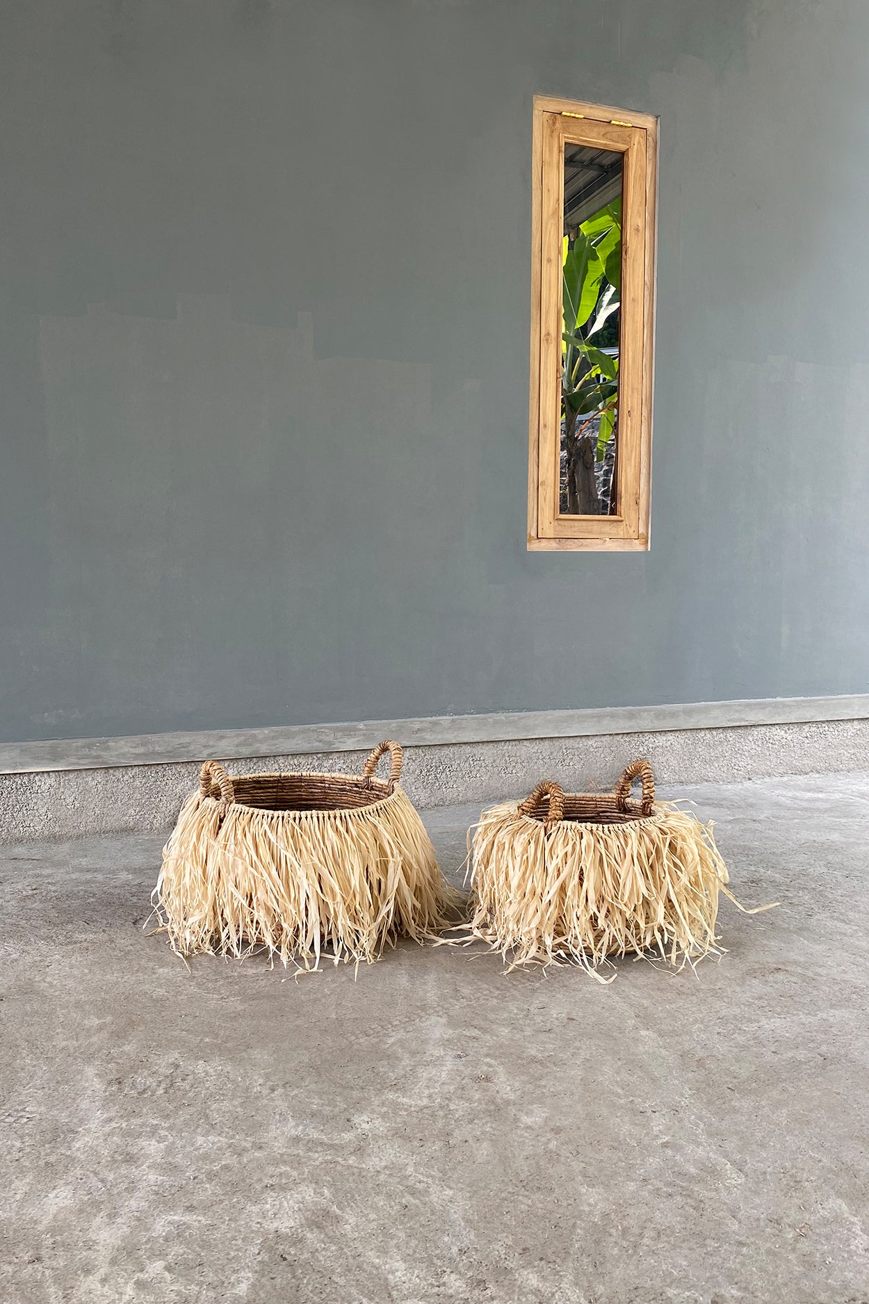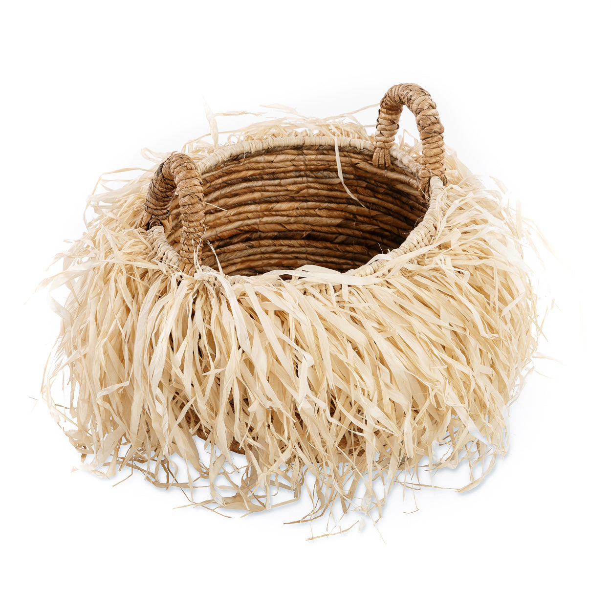 Aloha! Deze tropische mand zal je hart stelen en je interieur opleuken. Gemaakt van bananenblad en versierd met raffia strengen om uw opbergruimte eruit te laten zien als iets van een ver eiland. Verkrijgbaar in twee maten.