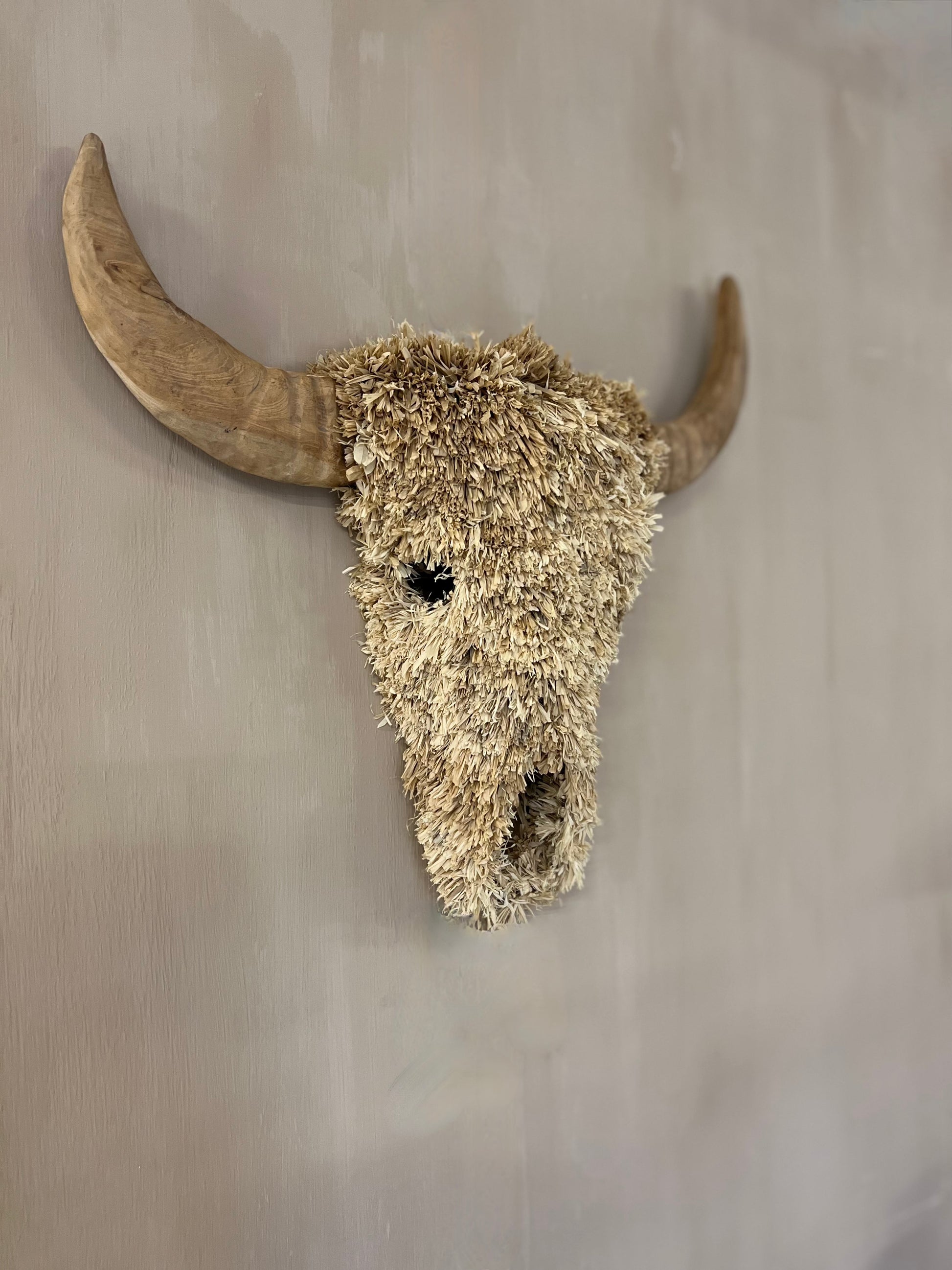 Weet je nog die geweien die mensen boven hun open haard plaatsten? Die dagen zijn voorbij! Deze met de hand gemaakte stierenkop van raffia en gerecycled teakhout is de diervriendelijke variant, die wacht om de aandacht te stelen in uw woonkamer, slaapkamer of kantoorruimte. De opvallende vorm en stijl zorgen voor een traditionele look die prachtig bij uw inrichting past. Beperkte oplage, slechts enkele stuks beschikbaar. Olé!