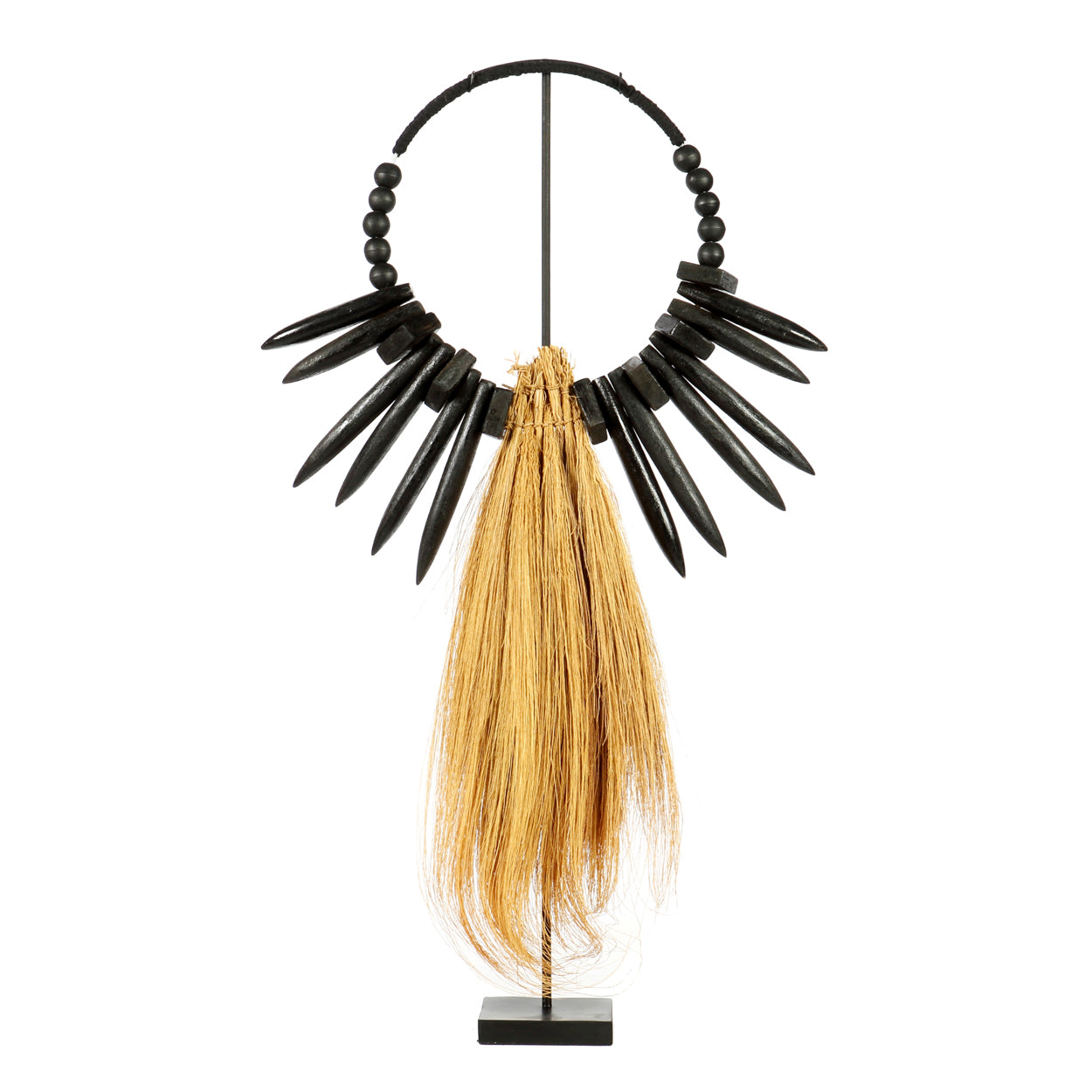Onze indrukwekkende rayongrasscherm op standaard, is een ware bohemienachtige schoonheid om elke plek in uw interieur, overdekt terras of tuin te versieren. De middelste halve cirkel is versierd met mooie contrasterende houten stukken en lang 'harig' gras.