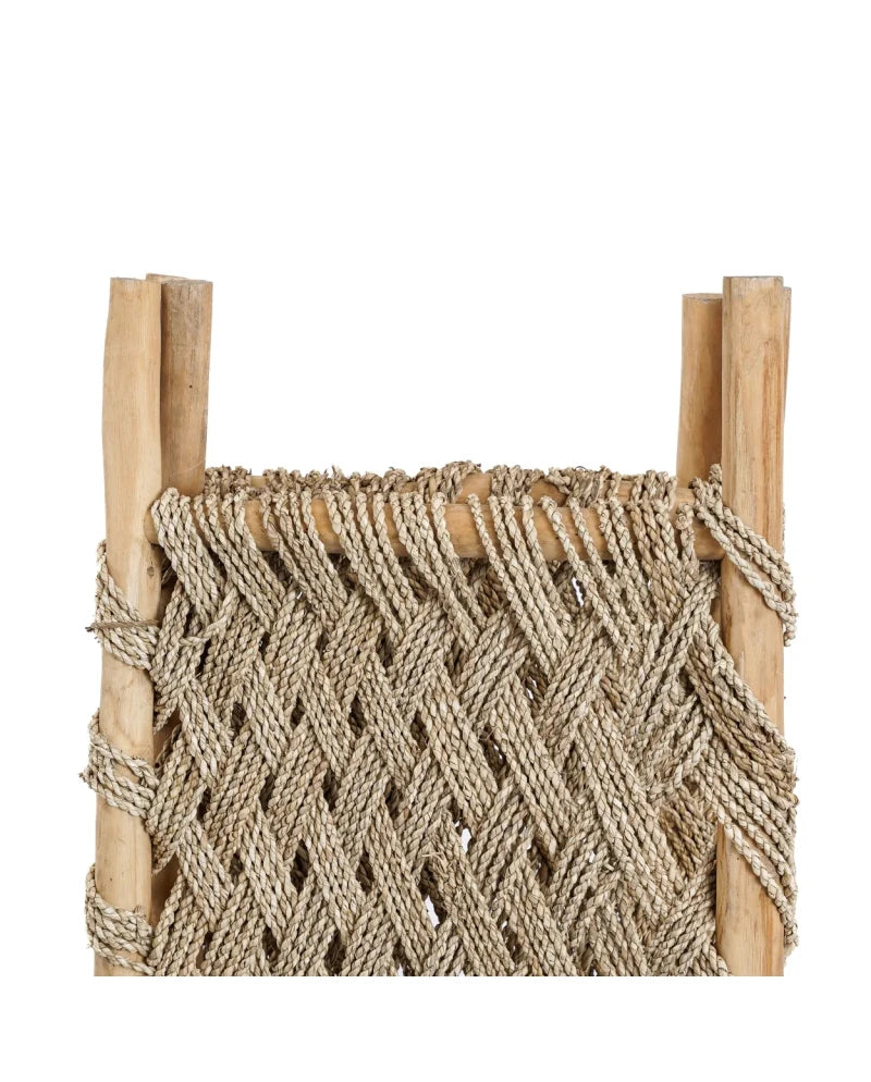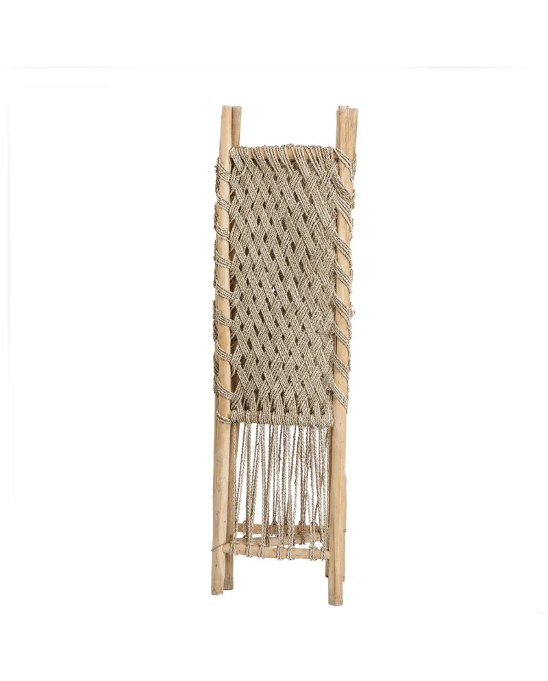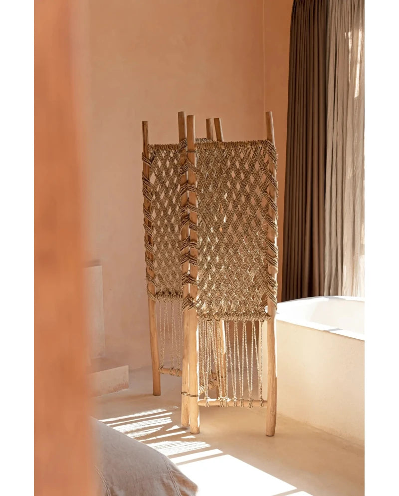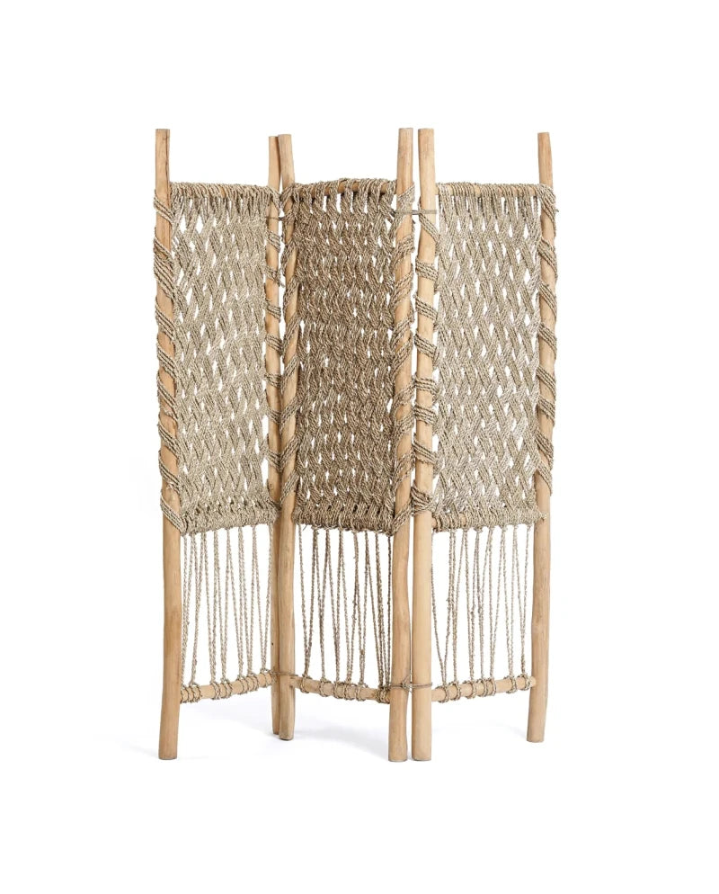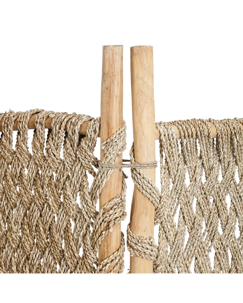 Verfraai je slaapkamer, woonkamer of overdekte buitenruimte met dit kamerscherm - een harmonieuze mix van natuurlijke materialen ontworpen om elke kamer interessanter te maken. De bovenste helft bestaat uit een gesloten zeegrasscherm, terwijl de onderste helft is gemaakt in een meer open patroon. Dit creëert een perfecte balans tussen privacy en openheid. Dit veelzijdige kamerscherm voegt niet alleen een vleugje natuurlijke elegantie toe aan je inrichting, maar verdeelt je ruimte ook moeiteloos in stijl. Verwelkom de schoonheid van teakhout en zeegras in je huis met dit functionele en visueel aantrekkelijke kamerscherm.