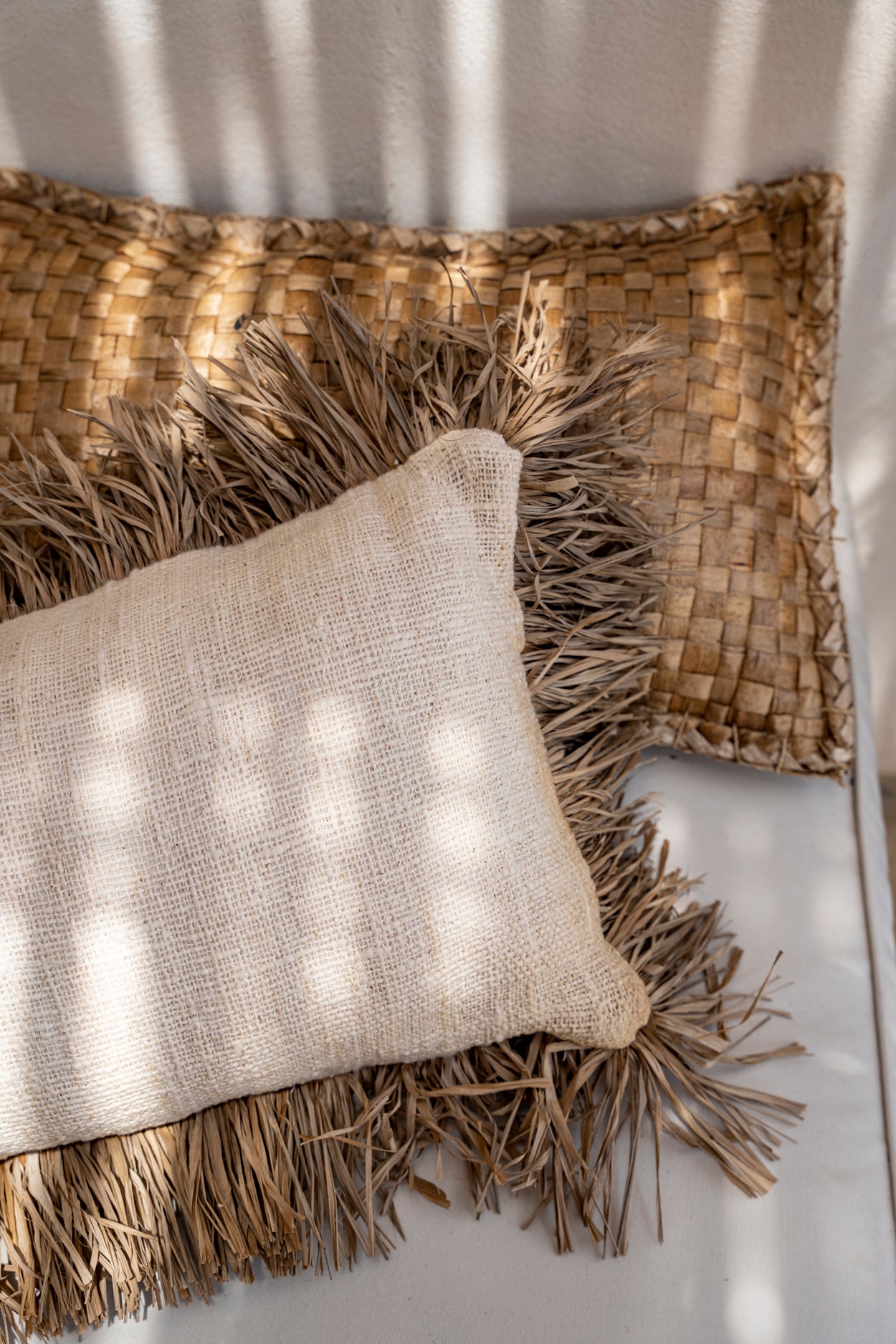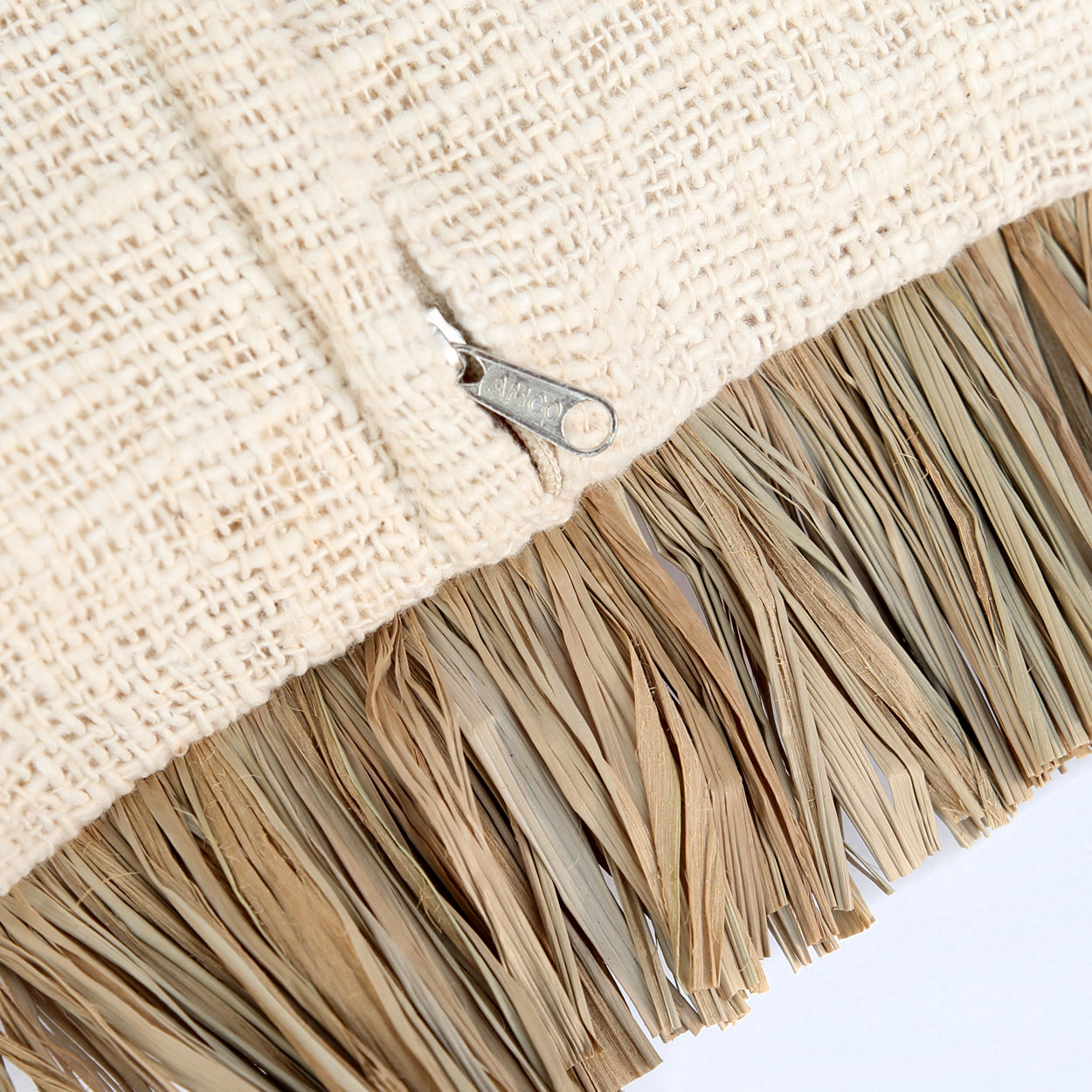Een must in huis in villa-stijl! Ons kussen met raffia franjes voegt een prachtig textuurelement toe aan uw stoffering. Een onmisbaar stuk om wat boho touch aan uw interieur, tuin of terras toe te voegen. Eindeloze mogelijkheden...