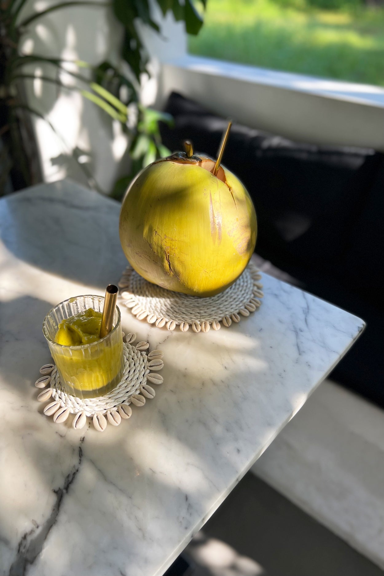 Breng de eilandstijl in uw huis met deze Seagrass onderzetters. Ze zijn omringd door kaurischelpen en passen bij elke tafelsetting.