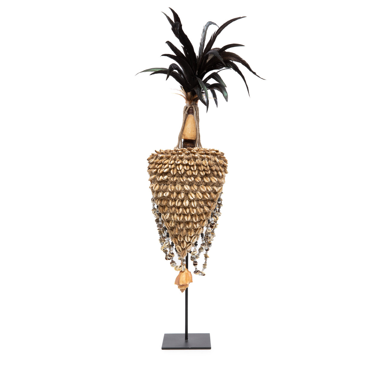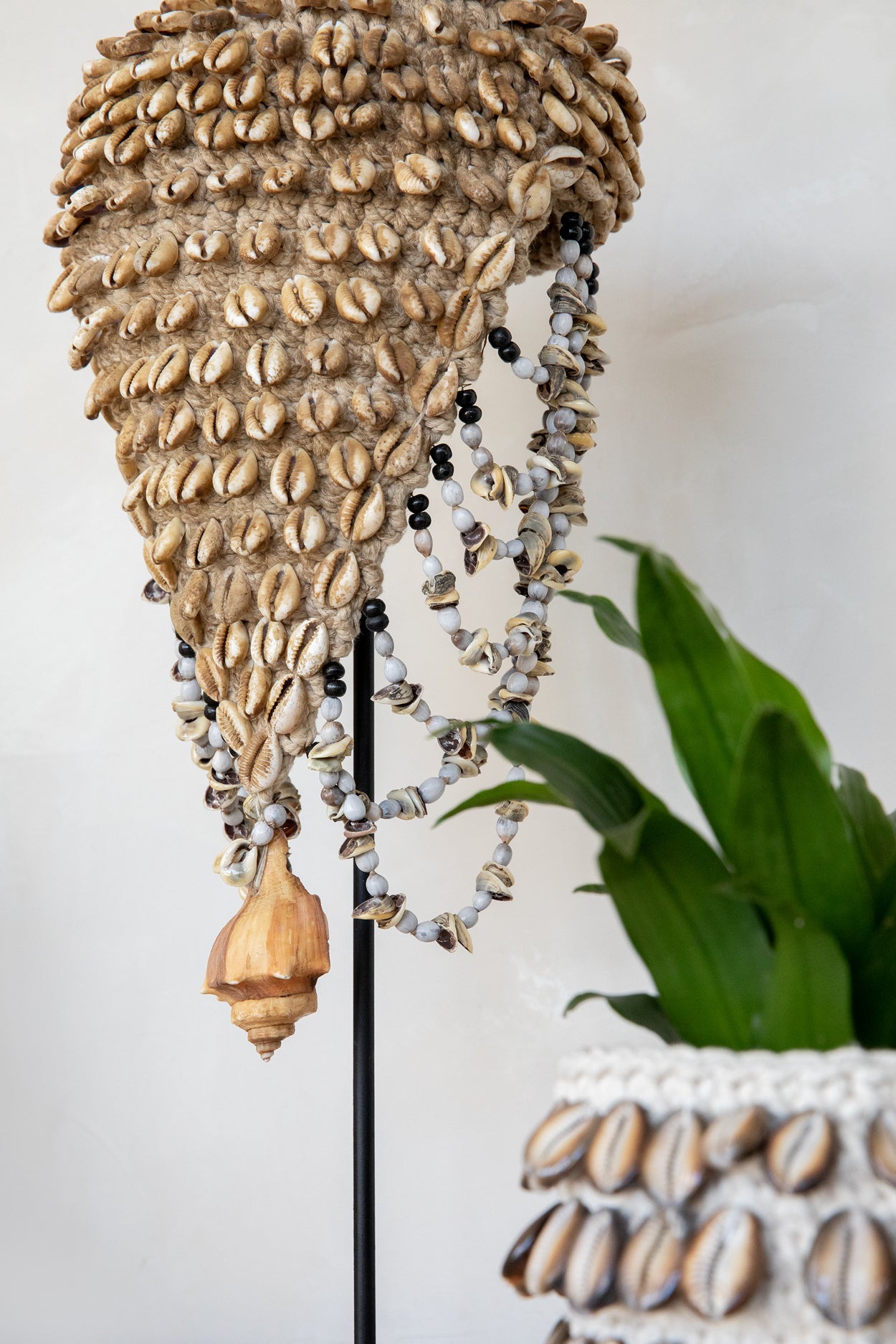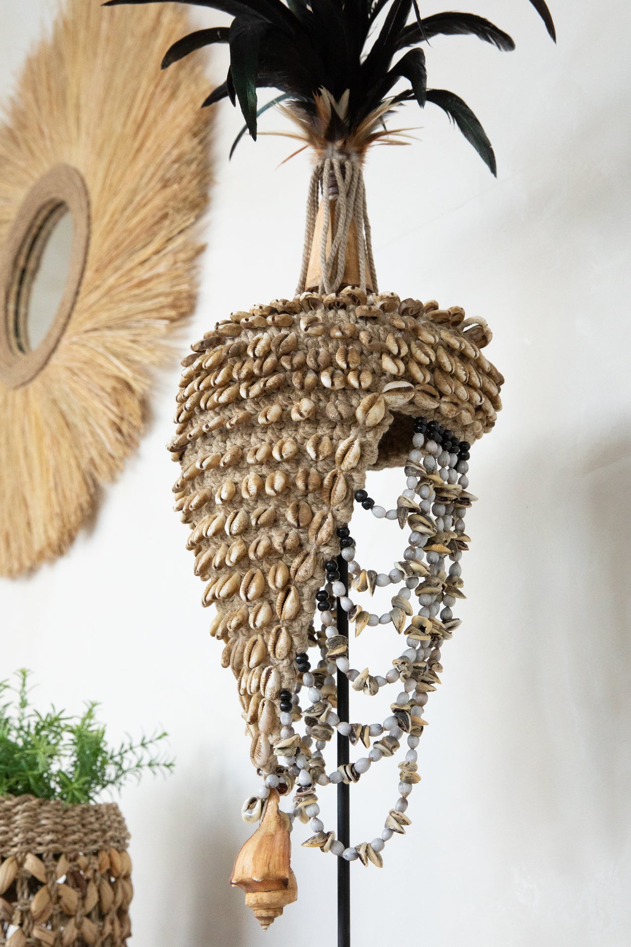 Dit prachtige kunstwerk combineert veren, schelpen en touw - allemaal verzameld van de stranden van Bali - tot een pronkstuk voor elke kast, open haard, tafel of waar u maar een uniek stuk nodig hebt om de show te stelen. De handgemaakte kwaliteit straalt echt in deze mooie decoratie op standaard.
