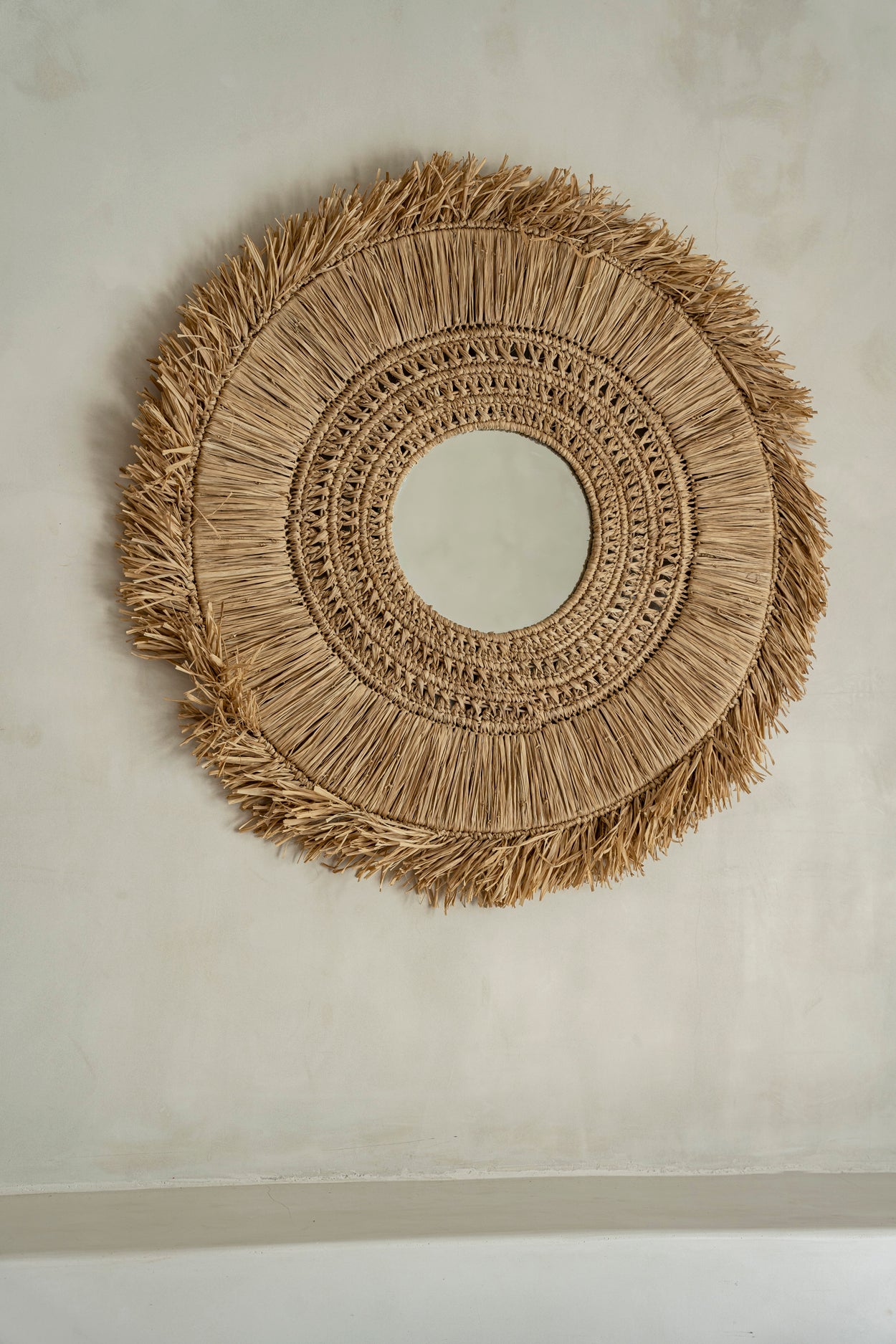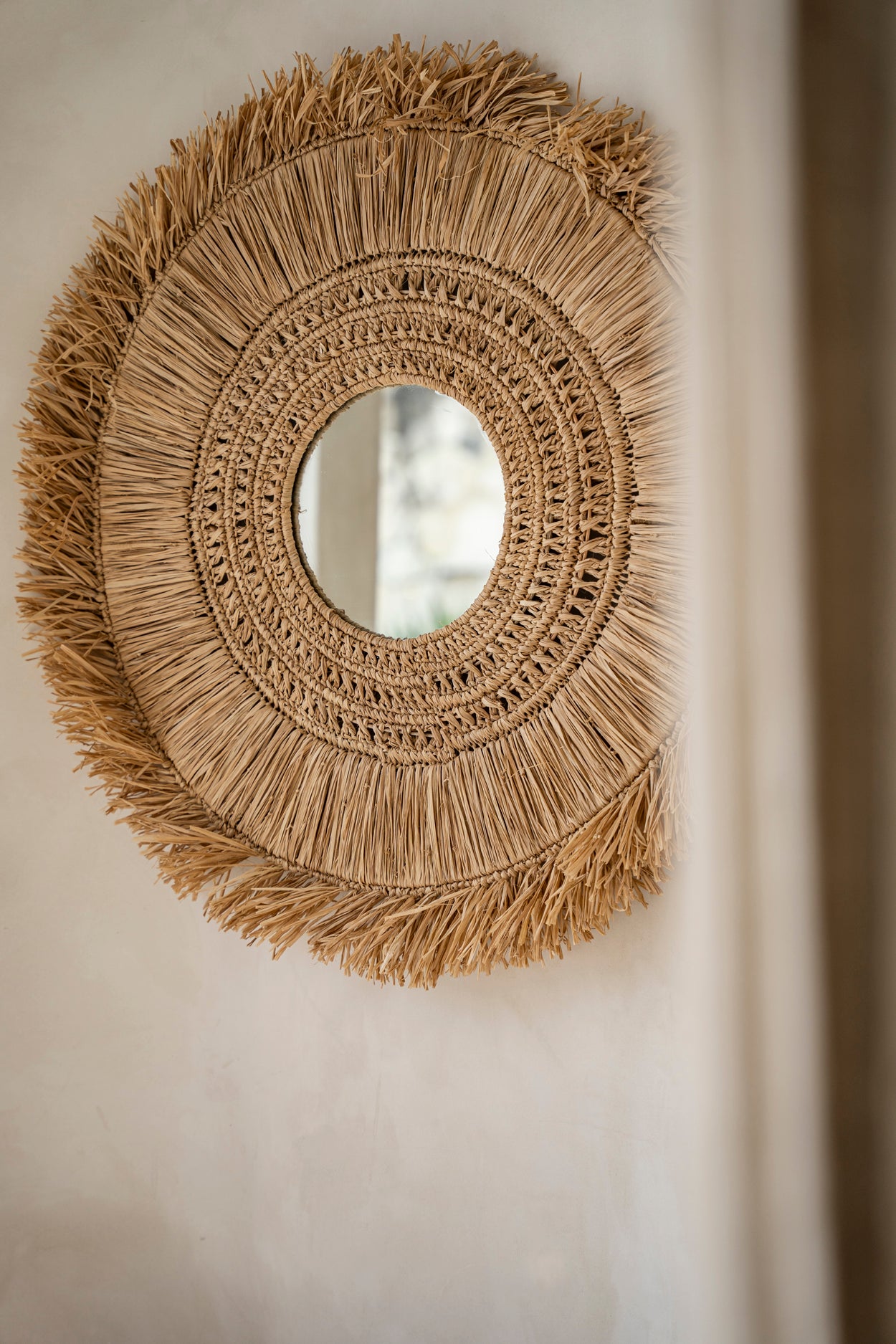 Het ontwerp van de Yuki spiegel is een verborgen schat; op het eerste gezicht eenvoudig, maar complexer naarmate je er langer naar kijkt. Vijf ringen van verschillende raffiaweefsels breiden zich naar buiten uit tot franjes die die typische kustsfeer uitstralen. De natuurlijke kleur van het materiaal past in elk interieur en in elke ruimte, maar we raden je aan om dit prachtige ontwerp een ereplaats te geven.